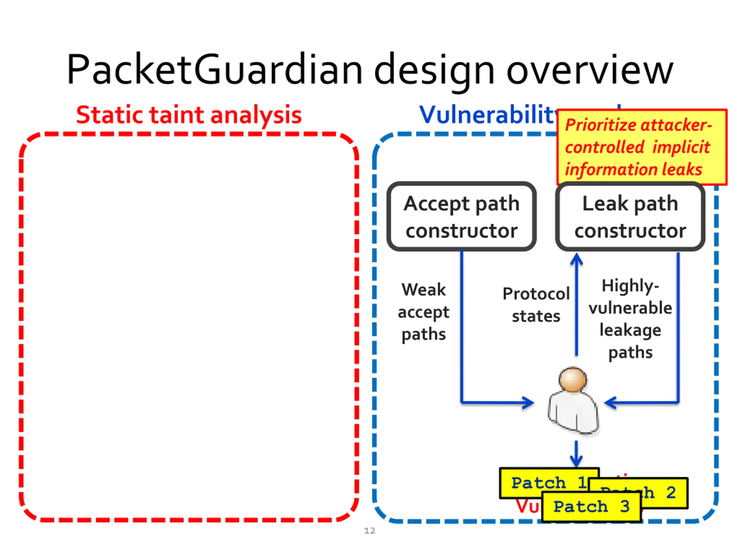 PacketGuardian design overview Static taint analysis Vulnerability analyzer Prioritize attacker- controlled implicit information leaks Accept path constructor Leak path constructor Highly- vulnerable leakage paths Weak accept paths Protocol states Packet injection Vulnerabilities Patch 3 Patch 1Patch 2 12