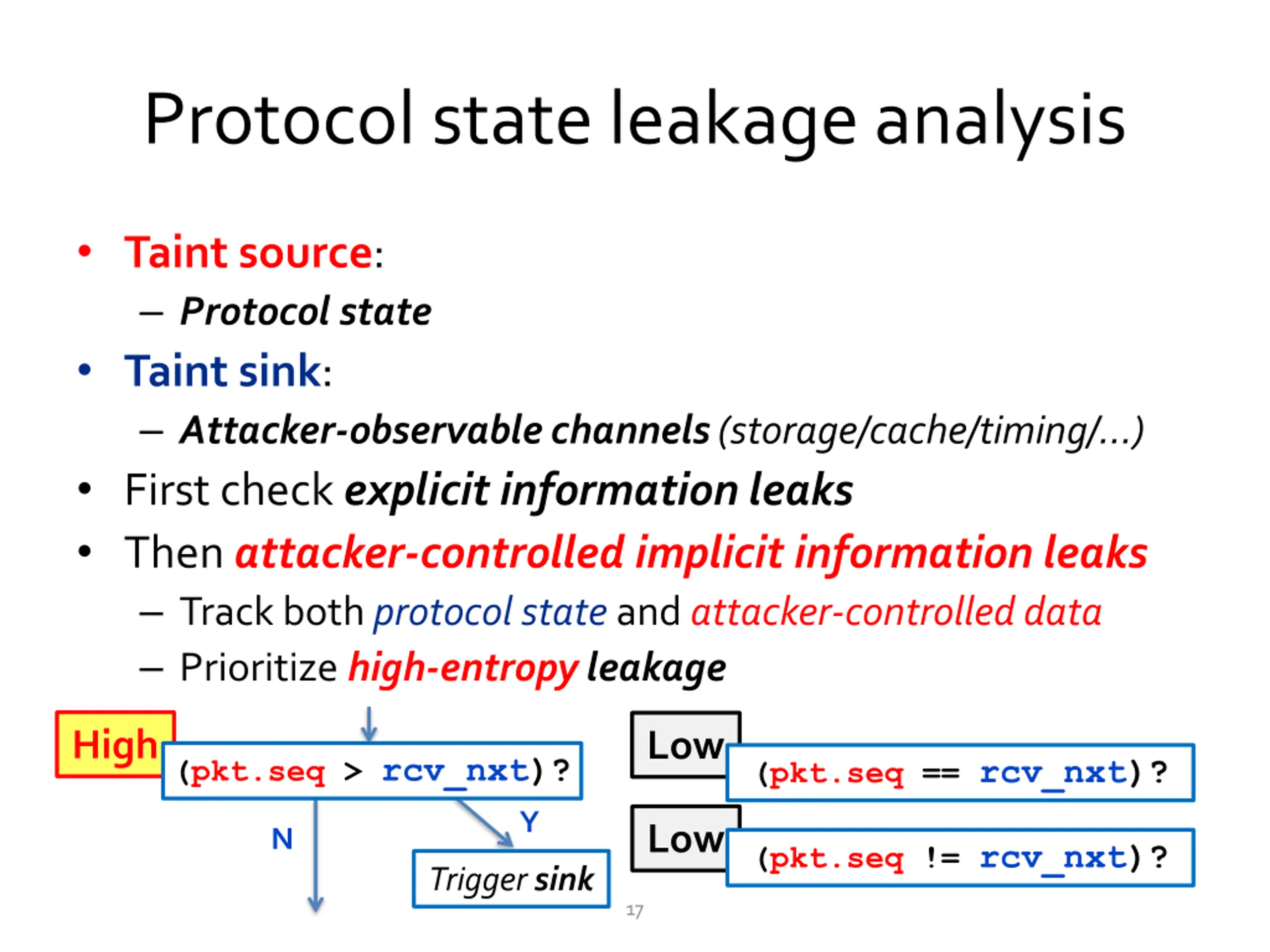 Protocol state leakage analysis Taint source: Protocol state Taint sink: Attacker-observablechannels(storage/cache/timing/ ) First check explicit information leaks Then attacker-controlled implicit information leaks Track both protocol state and attacker-controlled data Prioritize high-entropy leakage High(pkt.seq > rcv_nxt)? Low (pkt.seq == rcv_nxt)? Y Low N (pkt.seq != rcv_nxt)? Trigger sink 17