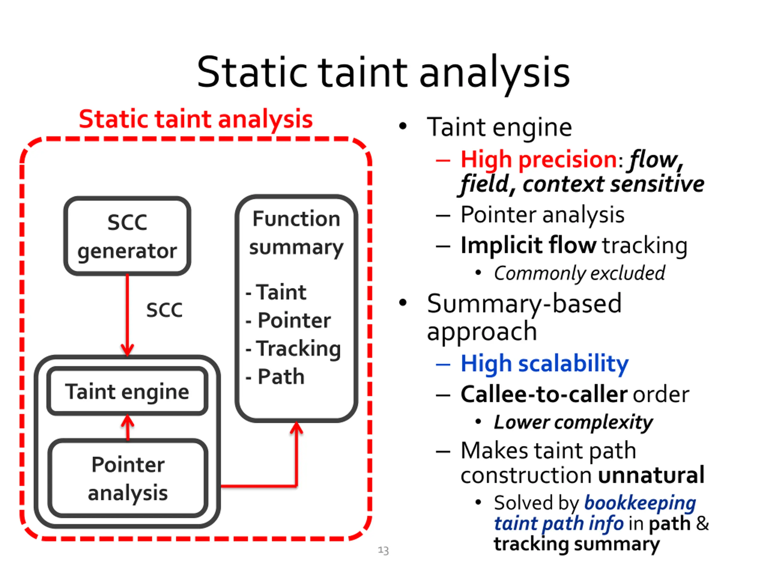Static taint analysis Static taint analysis Taint engine High precision: flow, field, context sensitive Pointer analysis Implicit flow tracking Commonly excluded Summary-based approach High scalability Callee-to-caller order Lower complexity Makes taint path construction unnatural Solved by bookkeeping taint path info in path & tracking summary Function summary SCC generator - Taint - Pointer - Tracking - Path SCC Taint engine Pointer analysis 13