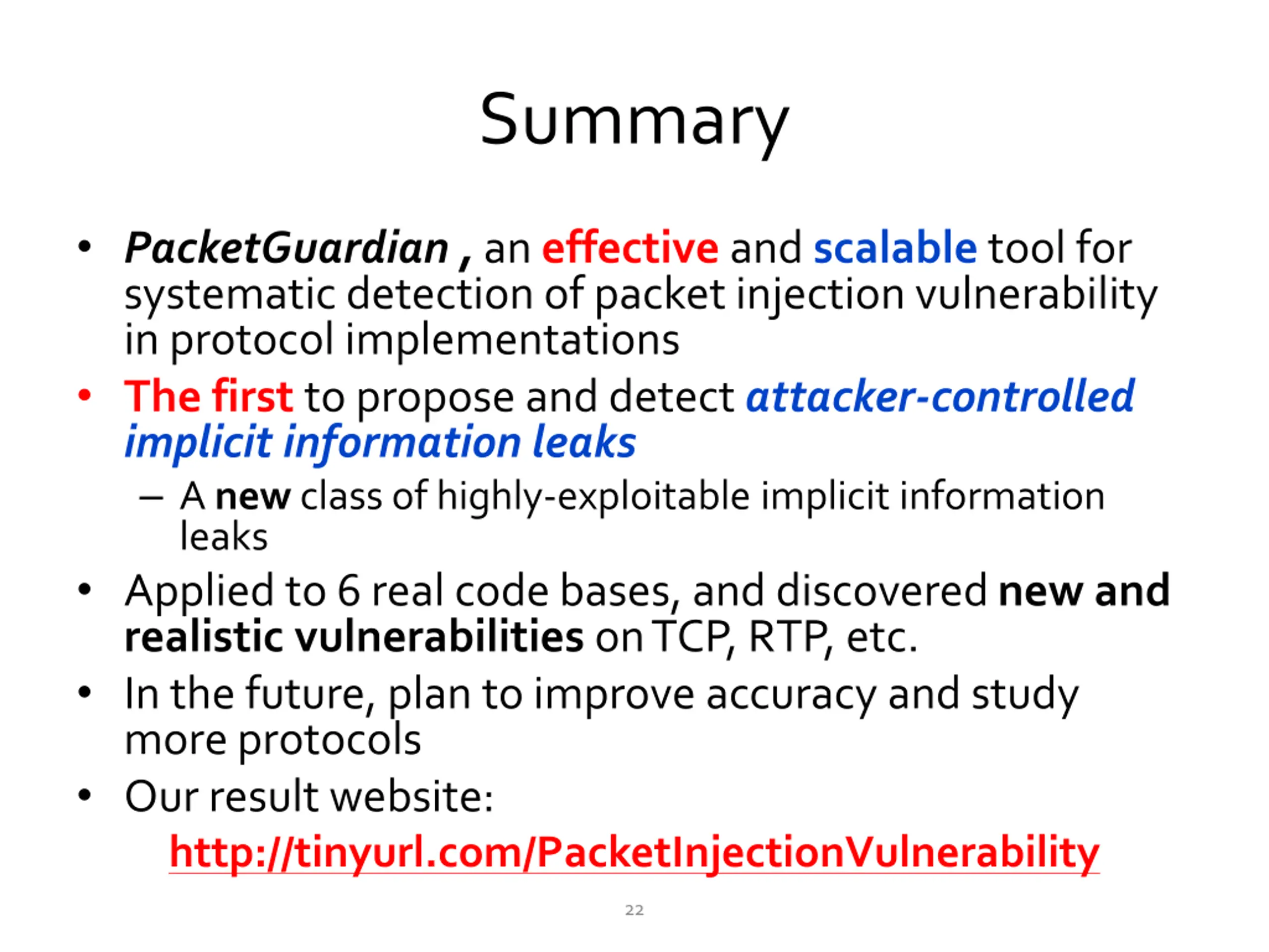 Summary PacketGuardian , an effective and scalable tool for systematic detection of packet injection vulnerability in protocol implementations The first to propose and detect attacker-controlled implicit information leaks A new class of highly-exploitable implicit information leaks Applied to 6 real code bases, and discovered new and realistic vulnerabilities on TCP, RTP, etc. In the future, plan to improve accuracy and study more protocols Our result website: http://tinyurl.com/PacketInjectionVulnerability 22