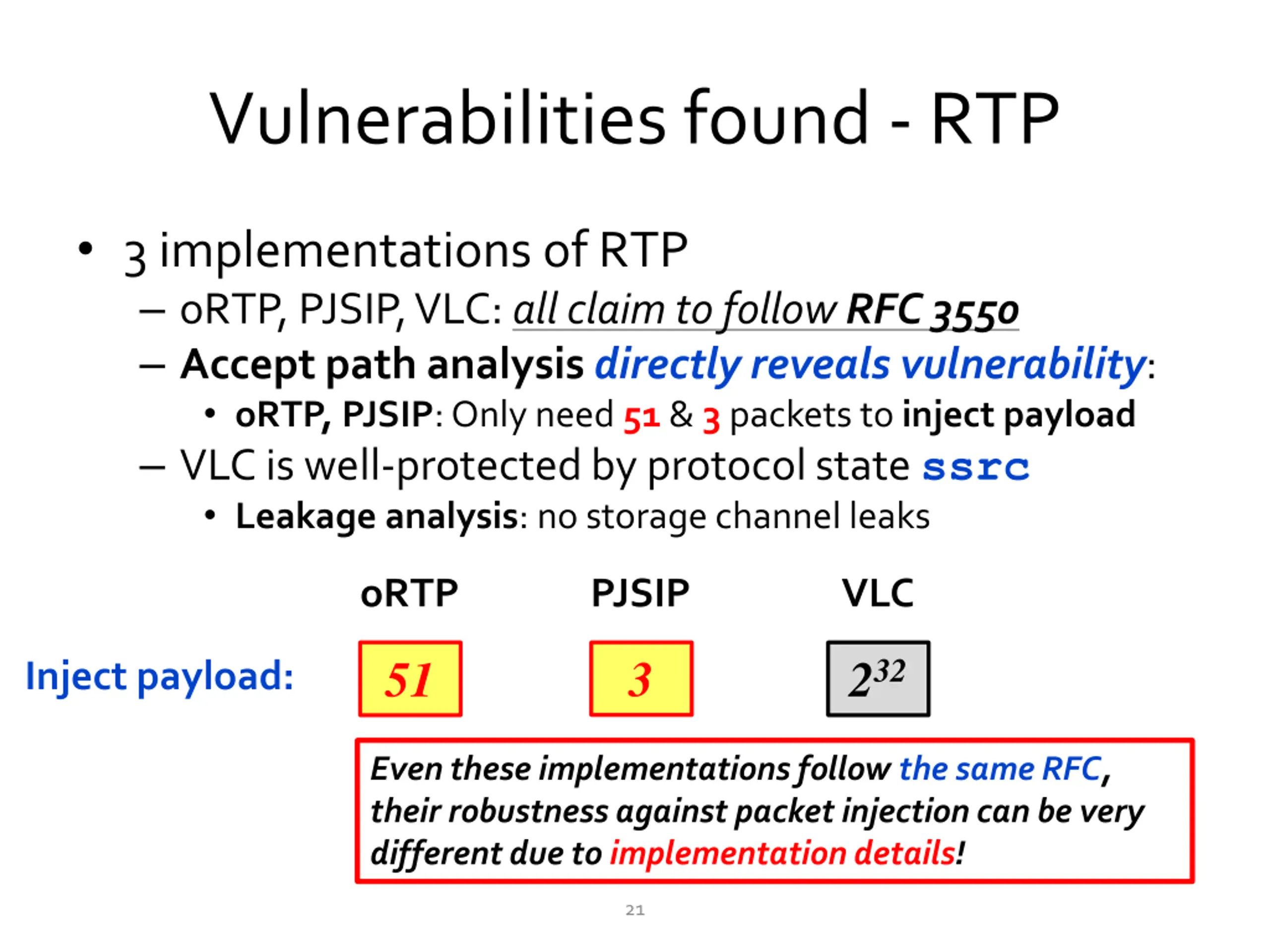 Vulnerabilities found - RTP 3 implementations of RTP oRTP, PJSIP, VLC: all claim to follow RFC 3550 Accept path analysis directly reveals vulnerability: oRTP, PJSIP: Only need 51 & 3 packets to inject payload VLC is well-protected by protocol state ssrc Leakage analysis: no storage channel leaks oRTP PJSIP VLC 3 51 232 Inject payload: Even these implementations follow the same RFC, their robustness against packet injection can be very different due to implementation details! 21