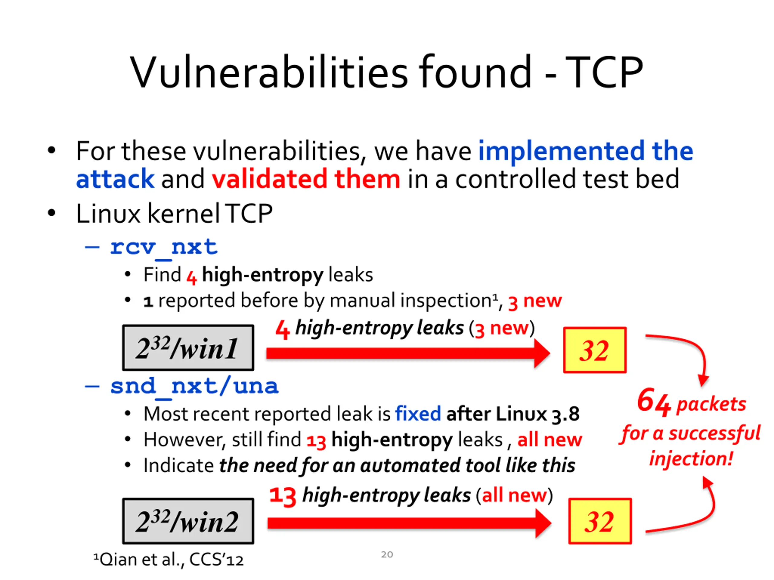 Vulnerabilities found - TCP For these vulnerabilities, we have implemented the attack and validatedthem in a controlled test bed Linux kernel TCP rcv_nxt Find 4high-entropy leaks 1 reported before by manual inspection1, 3 new 4high-entropy leaks (3 new) 232/win1 32 snd_nxt/una Most recent reported leak is fixed after Linux 3.8 However, still find 13high-entropy leaks , all new Indicate the need for an automated tool like this 13high-entropy leaks (all new) 64 packets for a successful injection! 232/win2 32 20 1Qian et al., CCS 12