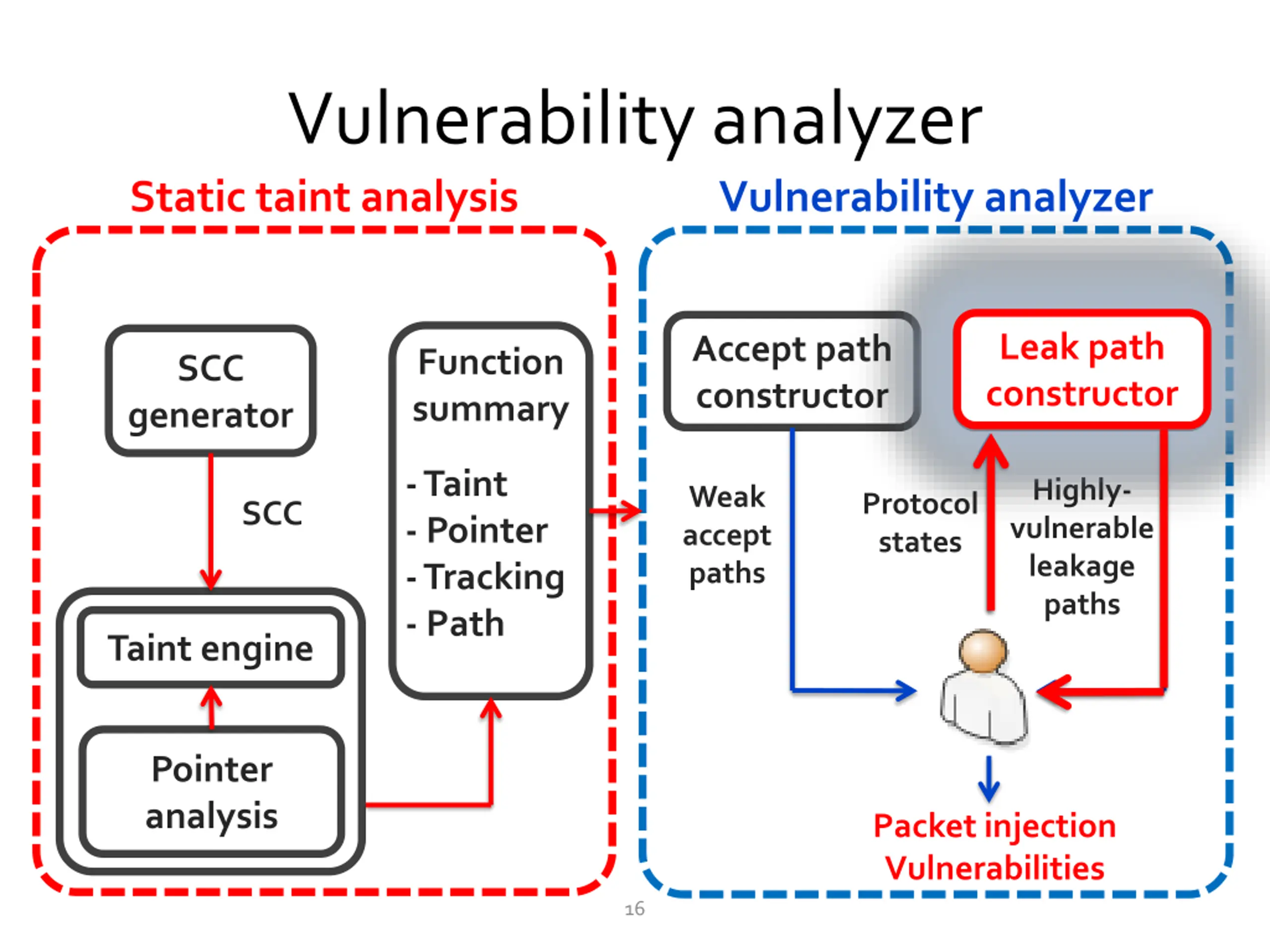Vulnerability analyzer Static taint analysis Vulnerability analyzer Leak path Accept path constructor Leak path constructor constructor Function summary SCC generator - Taint - Pointer - Tracking - Path Highly- vulnerable leakage paths Weak accept paths Protocol states SCC Taint engine Pointer analysis Packet injection Vulnerabilities 16