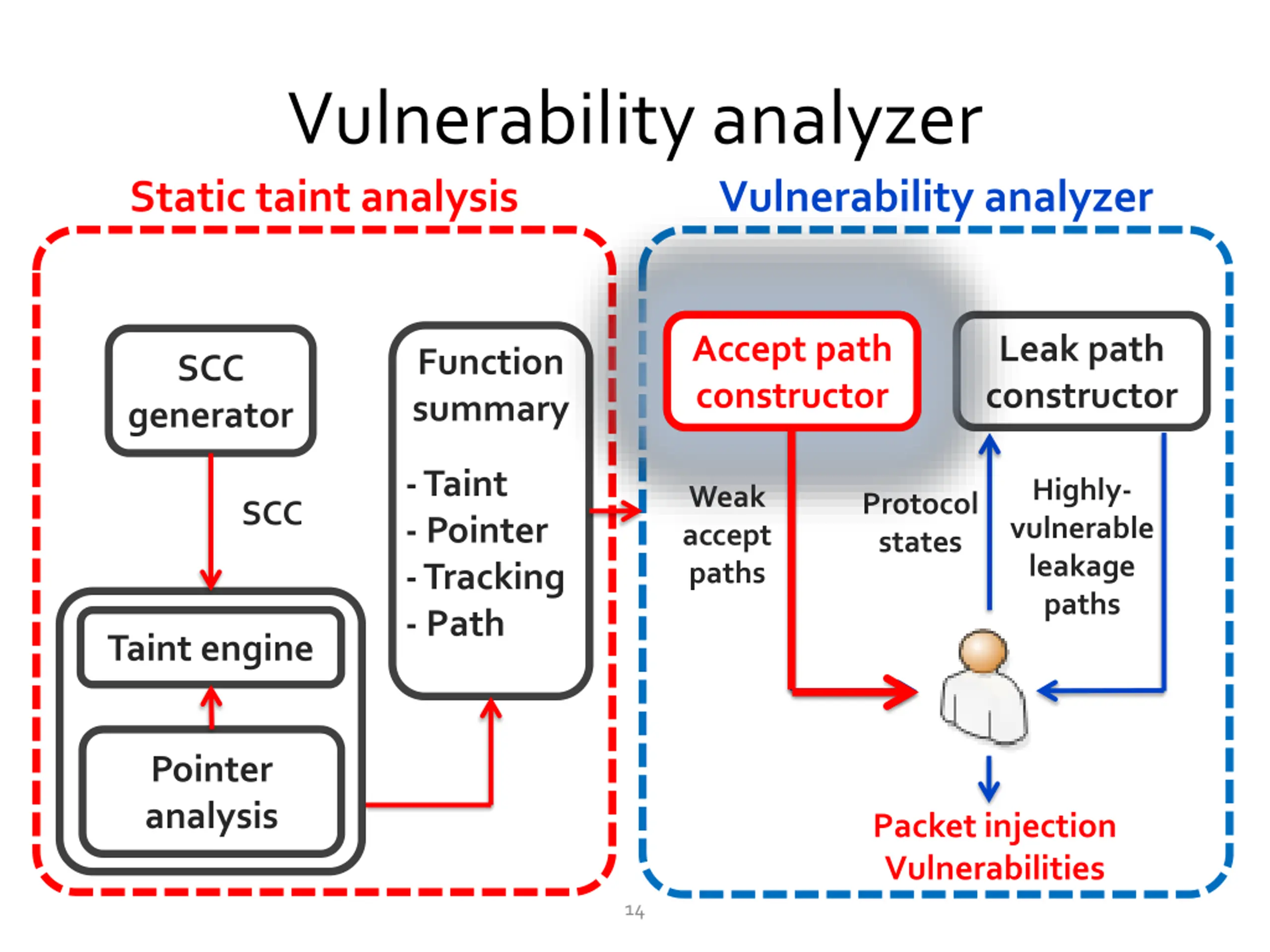 Vulnerability analyzer Static taint analysis Vulnerability analyzer Accept path Accept path constructor constructor Leak path constructor Function summary SCC generator - Taint - Pointer - Tracking - Path Highly- vulnerable leakage paths Weak accept paths Protocol states SCC Taint engine Pointer analysis Packet injection Vulnerabilities 14
