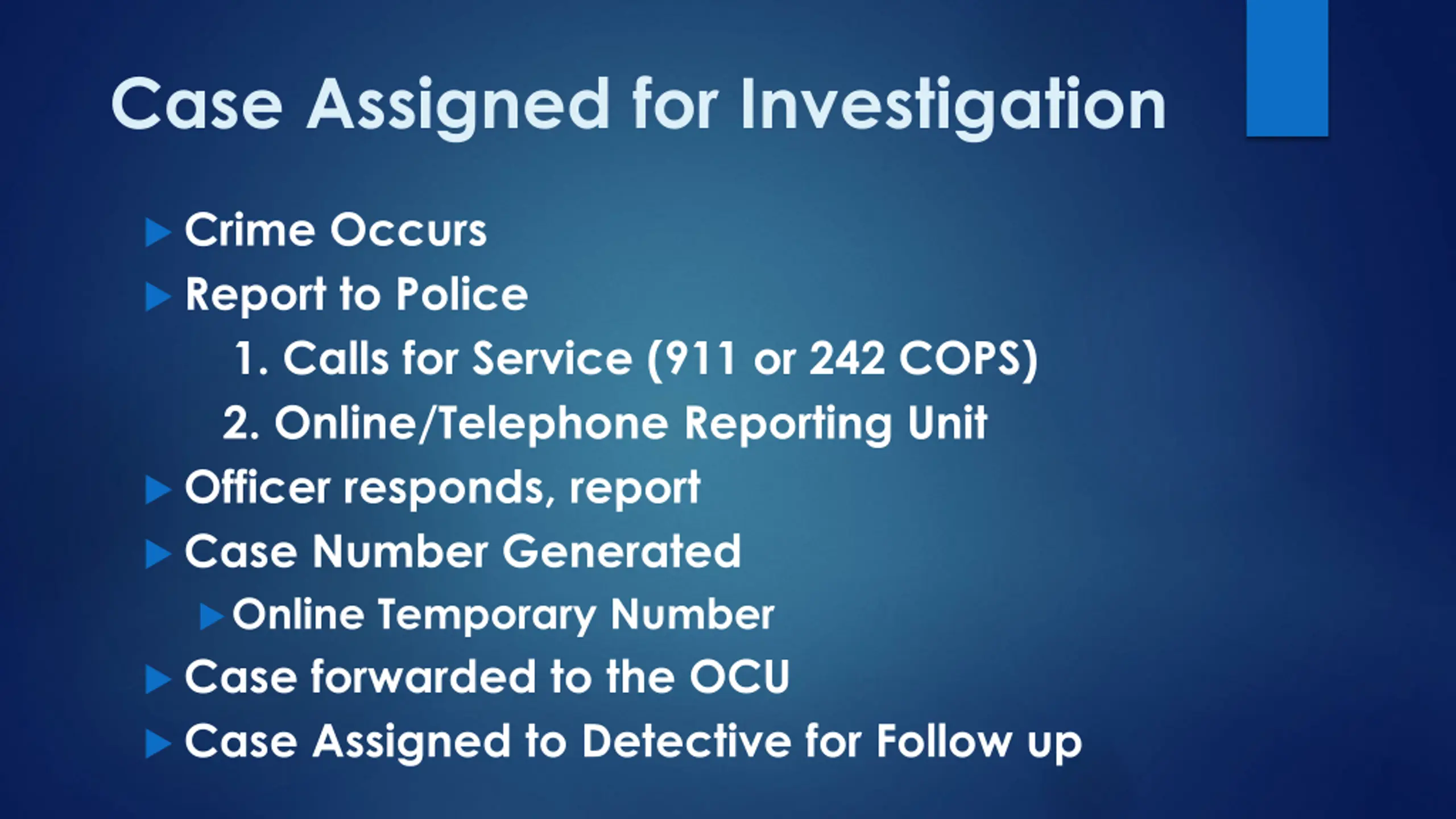 Case Assigned for Investigation Crime Occurs Report to Police 1. Calls for Service (911 or 242 COPS) 2. Online/Telephone Reporting Unit Officer responds, report Case Number Generated Online Temporary Number Case forwarded to the OCU Case Assigned to Detective for Follow up