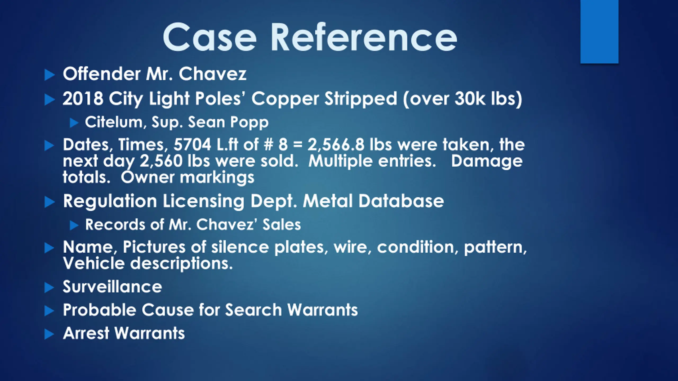 Case Reference Offender Mr. Chavez 2018 City Light Poles Copper Stripped (over 30k lbs) Citelum, Sup. Sean Popp Dates, Times, 5704 L.ft of # 8 = 2,566.8 lbs were taken, the next day 2,560 lbs were sold. Multiple entries. Damage totals. Owner markings Regulation Licensing Dept. Metal Database Records of Mr. Chavez Sales Name, Pictures of silence plates, wire, condition, pattern, Vehicle descriptions. Surveillance Probable Cause for Search Warrants Arrest Warrants