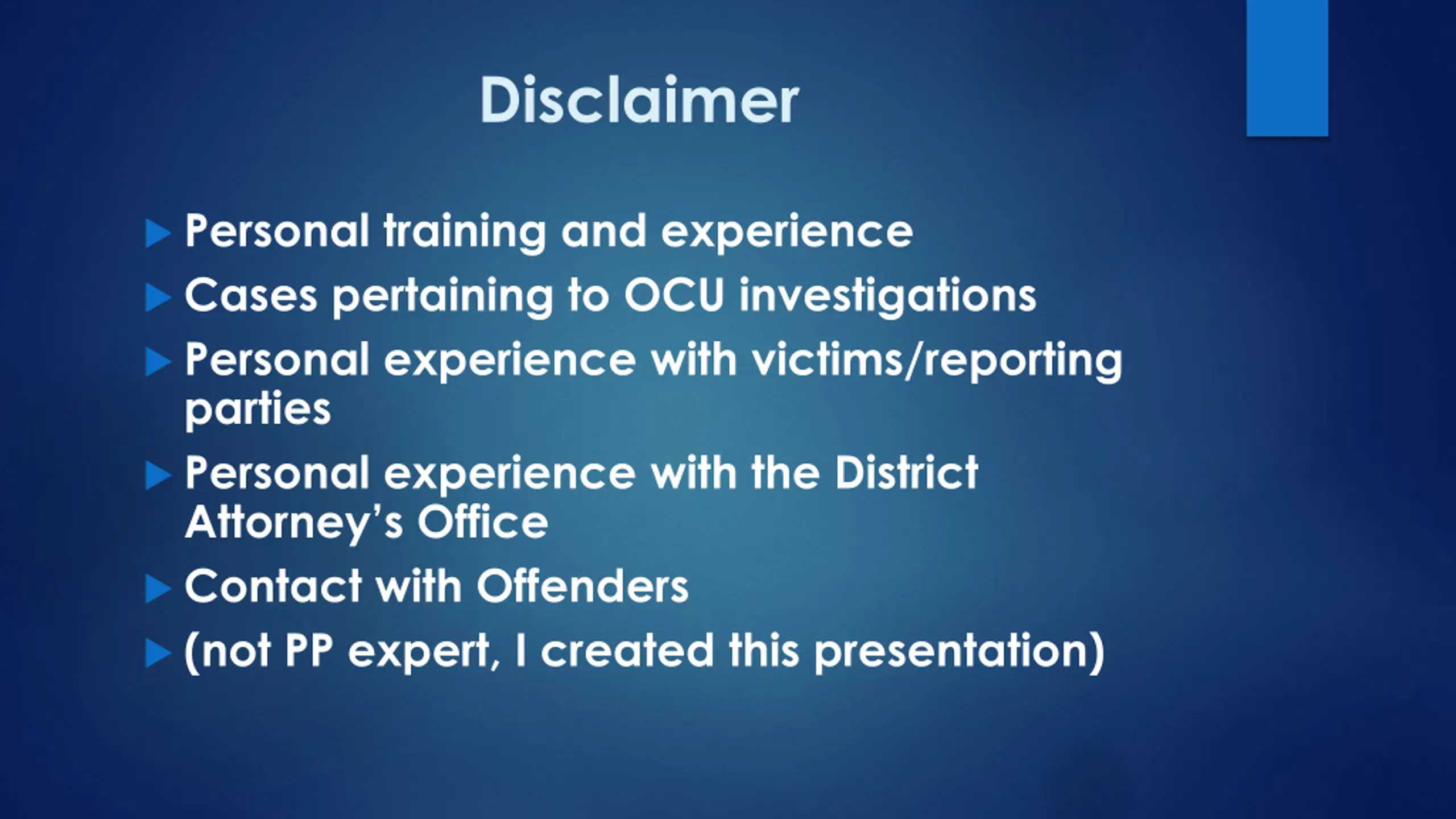 Disclaimer Personal training and experience Cases pertaining to OCU investigations Personal experience with victims/reporting parties Personal experience with the District Attorney s Office Contact with Offenders (not PP expert, I created this presentation)