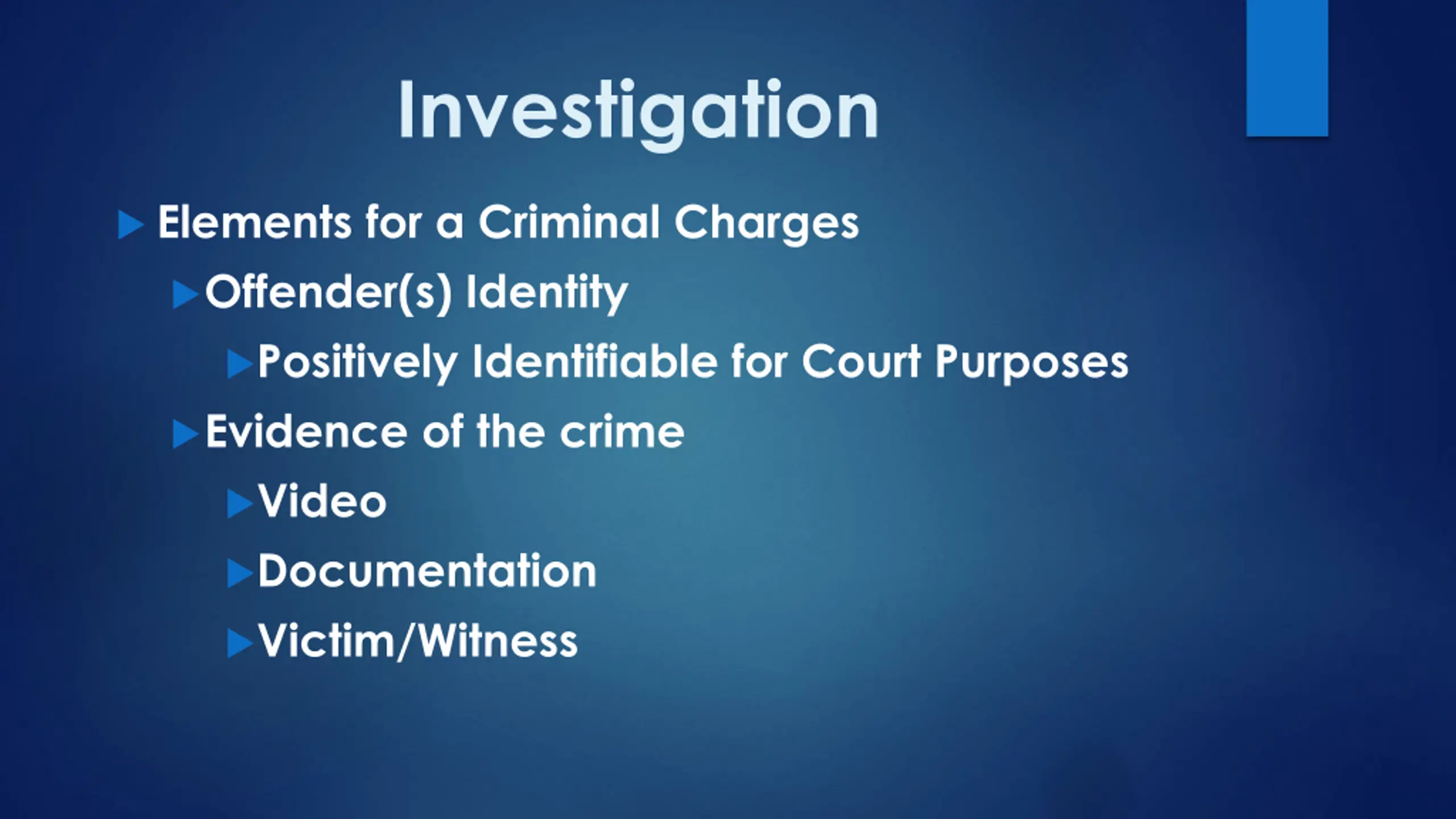 Investigation Elements for a Criminal Charges Offender(s) Identity Positively Identifiable for Court Purposes Evidence of the crime Video Documentation Victim/Witness