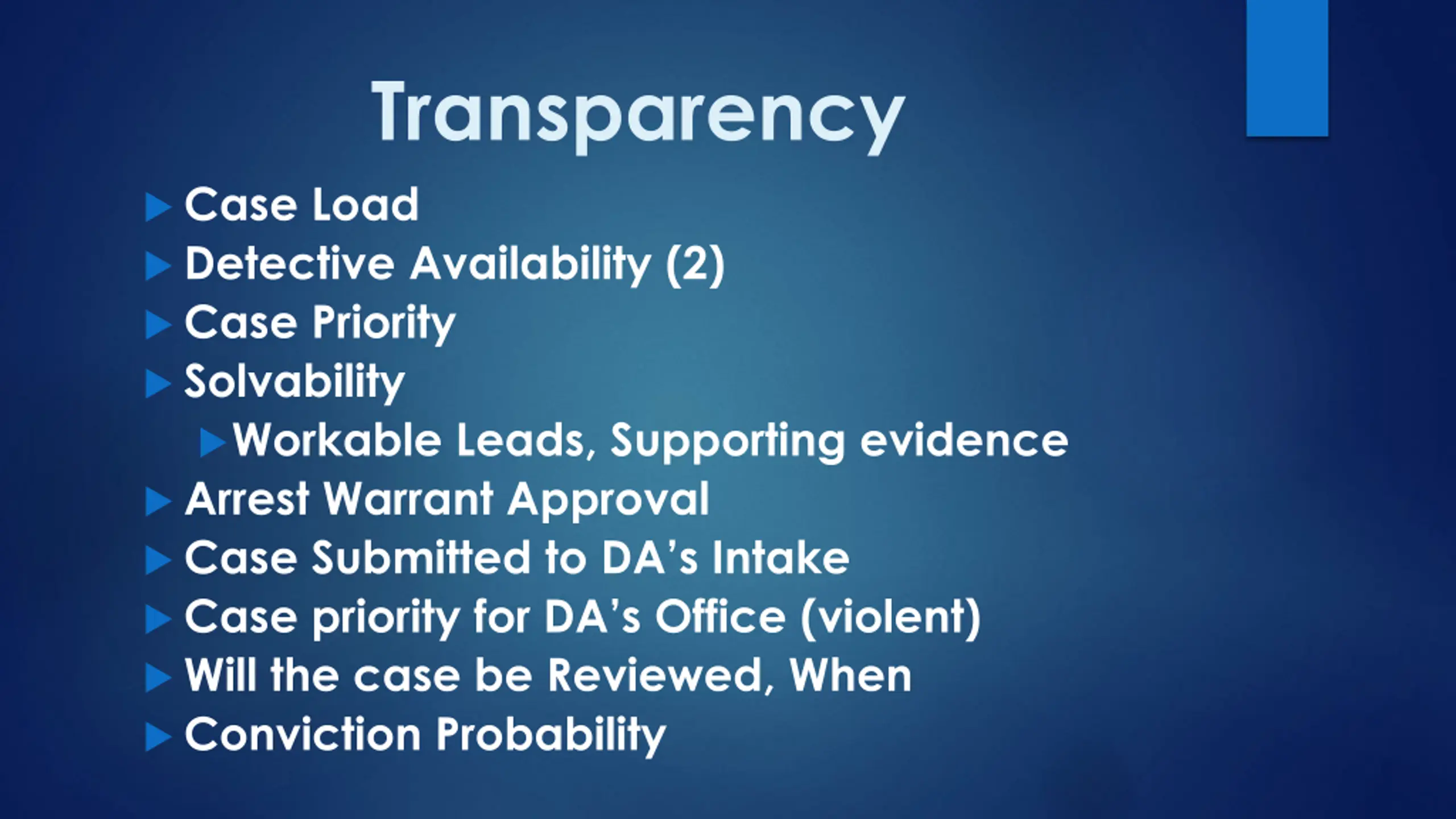 Transparency Case Load Detective Availability (2) Case Priority Solvability Workable Leads, Supporting evidence Arrest Warrant Approval Case Submitted to DA s Intake Case priority for DA s Office (violent) Will the case be Reviewed, When Conviction Probability