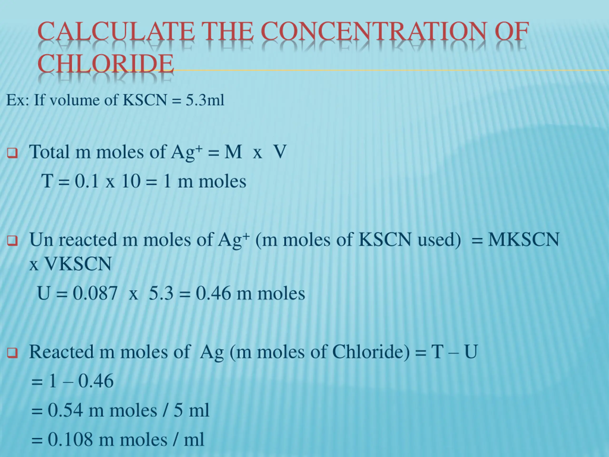 CALCULATE THE CONCENTRATION OF CHLORIDE Ex: If volume of KSCN = 5.3ml Total m moles of Ag+= M x V T = 0.1 x 10 = 1 m moles Un reacted m moles of Ag+(m moles of KSCN used) = MKSCN x VKSCN U = 0.087 x 5.3 = 0.46 m moles Reacted m moles of Ag (m moles of Chloride) = T U = 1 0.46 = 0.54 m moles / 5 ml = 0.108 m moles / ml