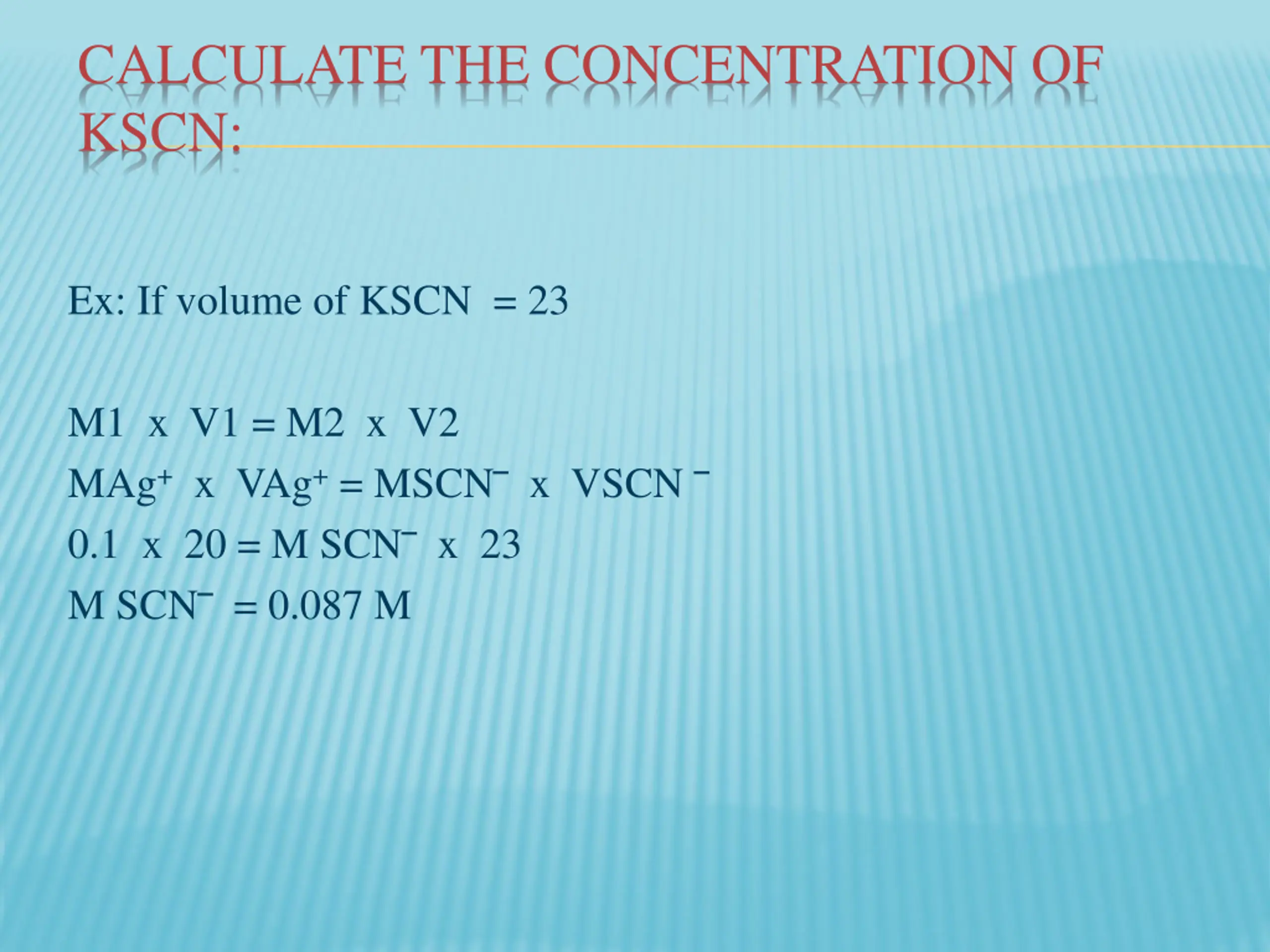 CALCULATE THE CONCENTRATION OF KSCN: Ex: If volume of KSCN = 23 M1 x V1 = M2 x V2 MAg+x VAg+= MSCN x VSCN 0.1 x 20 = M SCN x 23 M SCN = 0.087 M