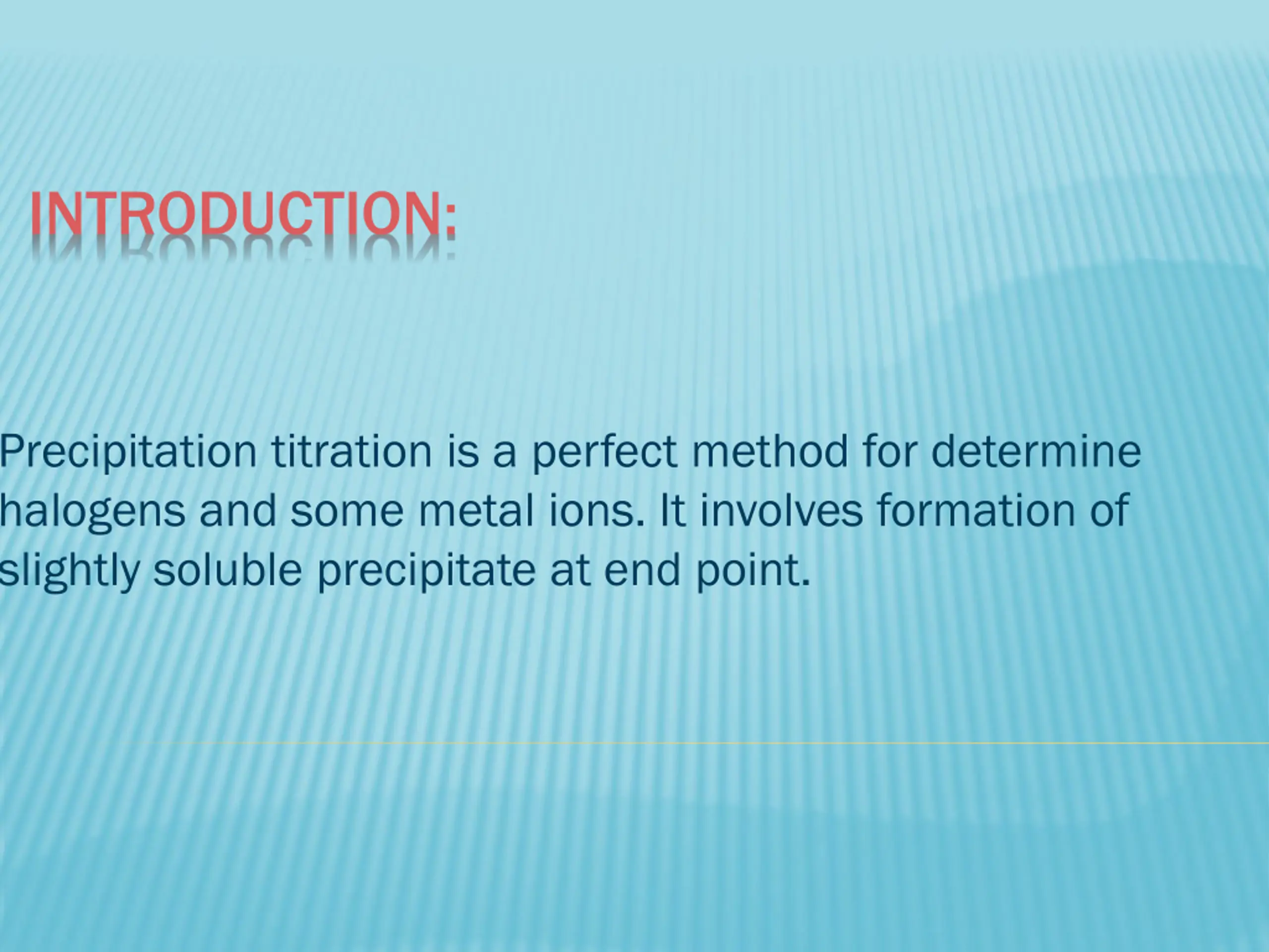 INTRODUCTION: Precipitation titration is a perfect method for determine halogens and some metal ions. It involves formation of slightly soluble precipitate at end point.