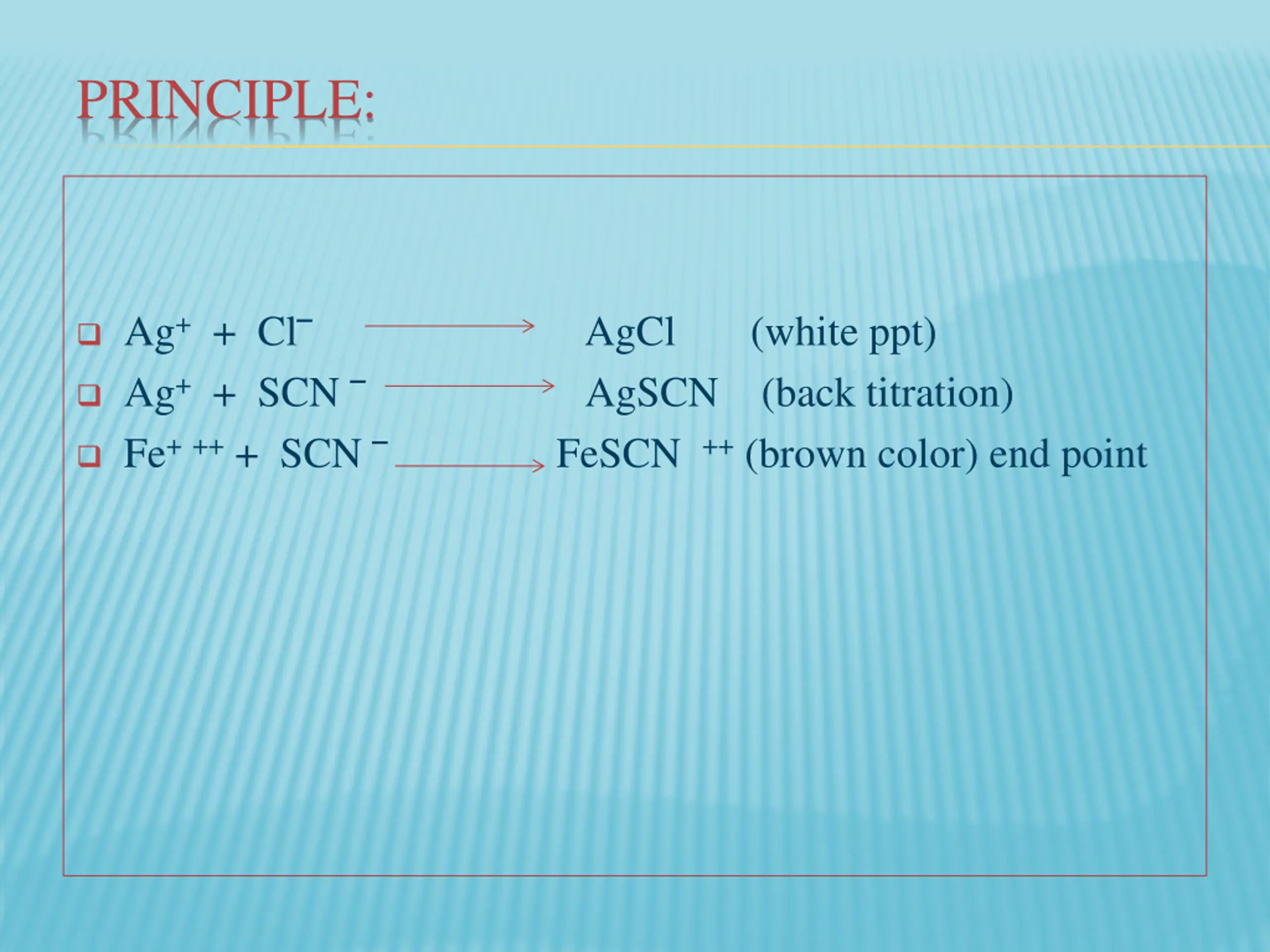 PRINCIPLE: Ag++ Cl AgCl Ag++ SCN AgSCN Fe+ +++ SCN FeSCN++(brown color) end point (white ppt) (back titration)