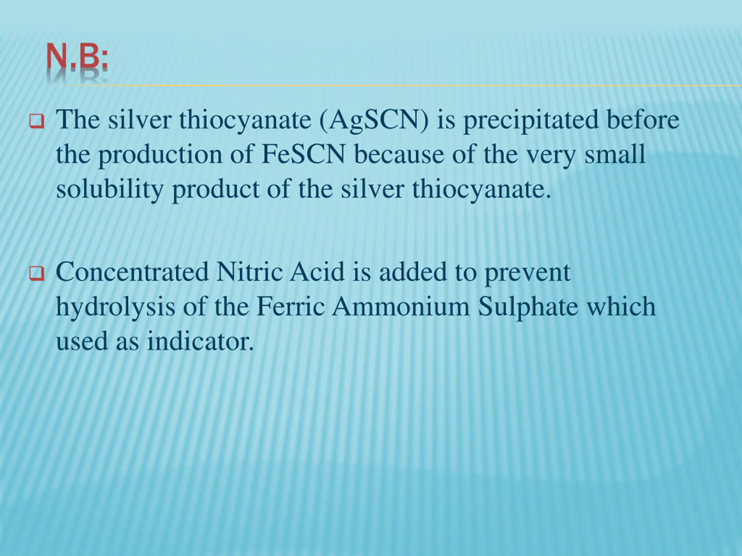 N.B: The silver thiocyanate (AgSCN) is precipitated before the production of FeSCN because of the very small solubility product of the silver thiocyanate. Concentrated Nitric Acid is added to prevent hydrolysis of the Ferric Ammonium Sulphate which used as indicator.