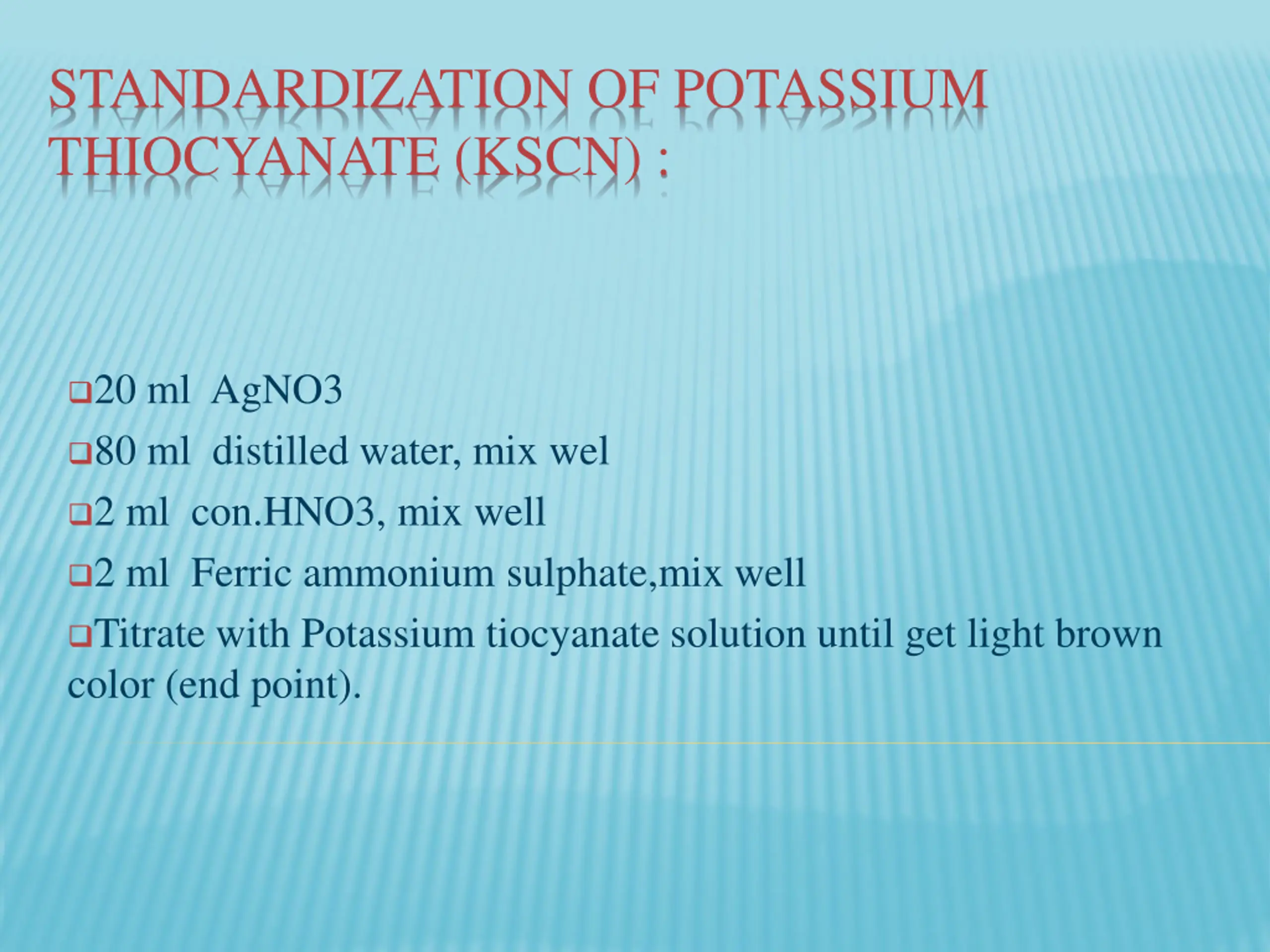 STANDARDIZATION OF POTASSIUM THIOCYANATE (KSCN) : 20 ml AgNO3 80 ml distilled water, mix wel 2 ml con.HNO3, mix well 2 ml Ferric ammonium sulphate,mix well Titrate with Potassium tiocyanate solution until get light brown color (end point).