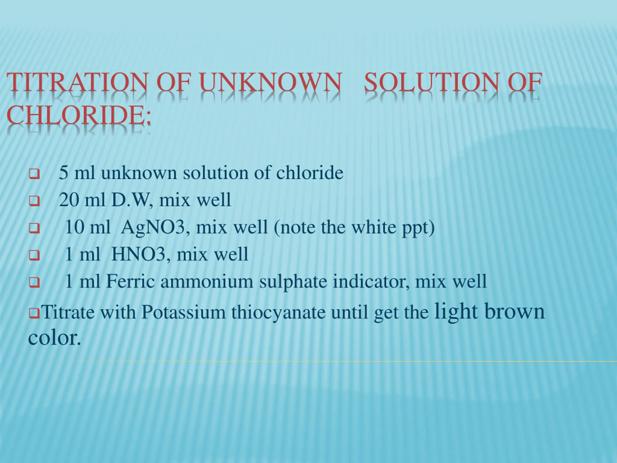 TITRATION OF UNKNOWN SOLUTION OF CHLORIDE: 5 ml unknown solution of chloride 20 ml D.W, mix well 10 ml AgNO3, mix well (note the white ppt) 1 ml HNO3, mix well 1 ml Ferric ammonium sulphate indicator, mix well Titrate with Potassium thiocyanate until get the light brown color.