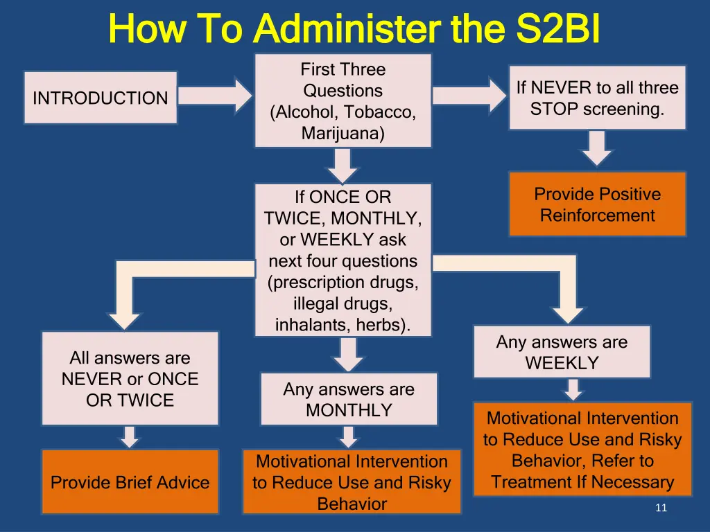 Screening Tool: S2BI Screening Tool: S2BI If answer to first three questions is Never then stop. Otherwise, ask the following four questions: In the past year, how many times have you used prescription drugs that were not prescribed for you (such as pain medication or Adderall)? In the past year, how many times have you used illegal drugs (such as cocaine or Ecstasy) In the past year, how many times have you used inhalants (such as nitrous oxide)? In the past year, how many times have you used herbs or synthetic drugs (such as salvia, K2 , or bath salts)? Same four choices for each question: Never, Once or Twice, Monthly, and Weekly 10