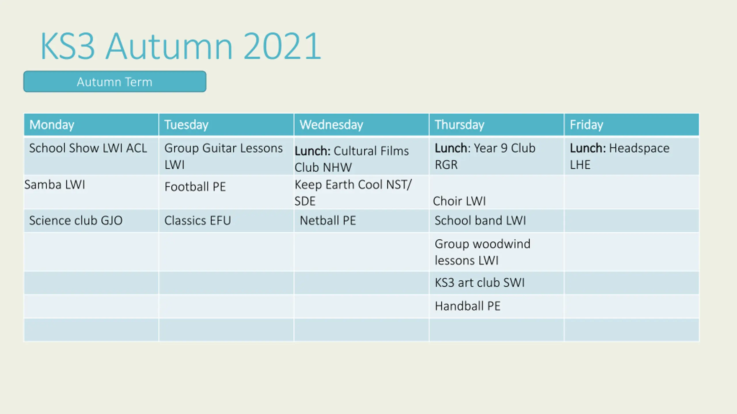 KS3 Autumn 2021 Autumn Term Monday Monday Tuesday Tuesday Wednesday Wednesday Thursday Thursday Friday Friday School Show LWI ACL Group Guitar Lessons LWI Lunch Lunch: Year 9 Club RGR Lunch: Lunch: Headspace LHE Lunch: Lunch: Cultural Films Club NHW Keep Earth Cool NST/ SDE Netball PE Samba LWI Football PE Choir LWI School band LWI Science club GJO Classics EFU Group woodwind lessons LWI KS3 art club SWI Handball PE