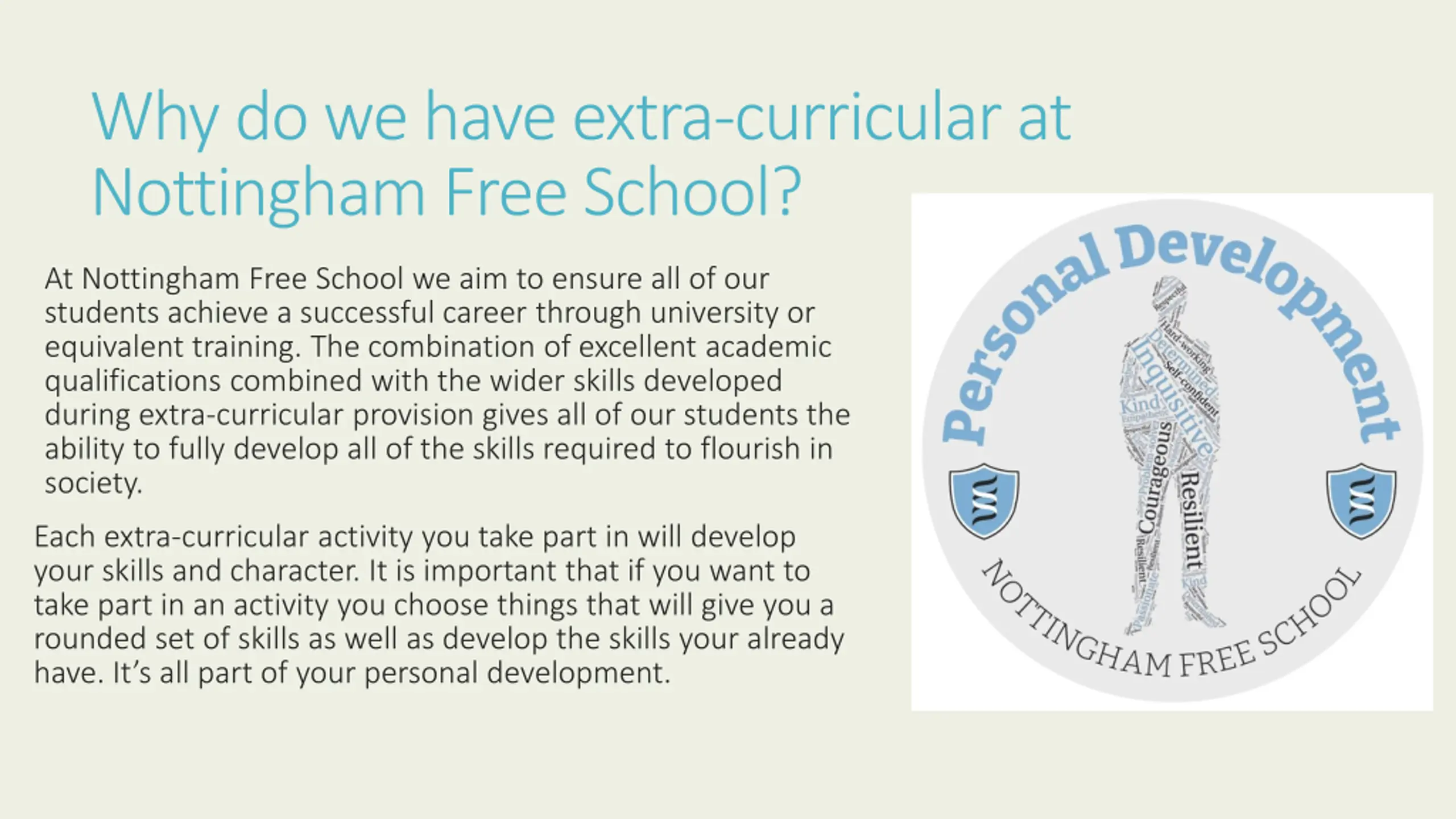 Why do we have extra-curricular at Nottingham Free School? At Nottingham Free School we aim to ensure all of our students achieve a successful career through university or equivalent training. The combination of excellent academic qualifications combined with the wider skills developed during extra-curricular provision gives all of our students the ability to fully develop all of the skills required to flourish in society. Each extra-curricular activity you take part in will develop your skills and character. It is important that if you want to take part in an activity you choose things that will give you a rounded set of skills as well as develop the skills your already have. It s all part of your personal development.