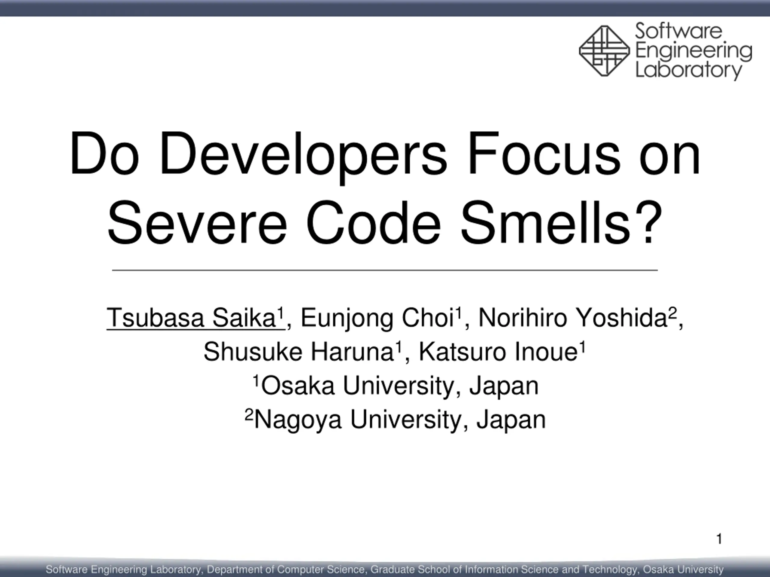 Do Developers Focus on Severe Code Smells? Tsubasa Saika1, Eunjong Choi1, Norihiro Yoshida2, Shusuke Haruna1, Katsuro Inoue1 1Osaka University, Japan 2Nagoya University, Japan 1 Software Engineering Laboratory, Department of Computer Science, Graduate School of Information Science and Technology, Osaka University