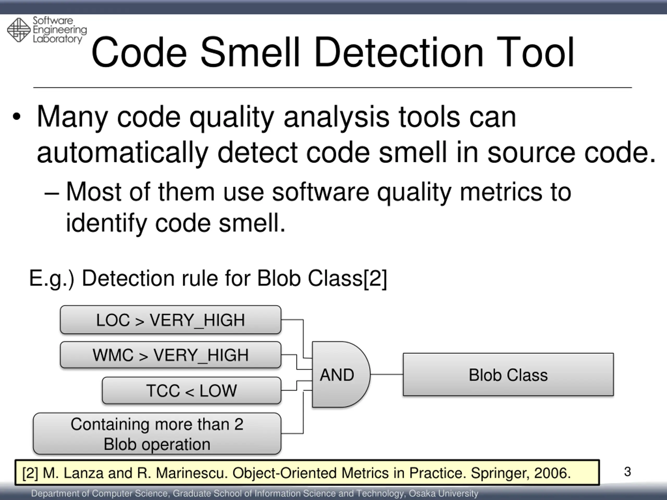 Code Smell Detection Tool Many code quality analysis tools can automatically detect code smell in source code. Most of them use software quality metrics to identify code smell. E.g.) Detection rule for Blob Class[2] LOC > VERY_HIGH WMC > VERY_HIGH AND Blob Class TCC < LOW Containing more than 2 Blob operation 3 [2] M. Lanza and R. Marinescu. Object-Oriented Metrics in Practice. Springer, 2006. Department of Computer Science, Graduate School of Information Science and Technology, Osaka University