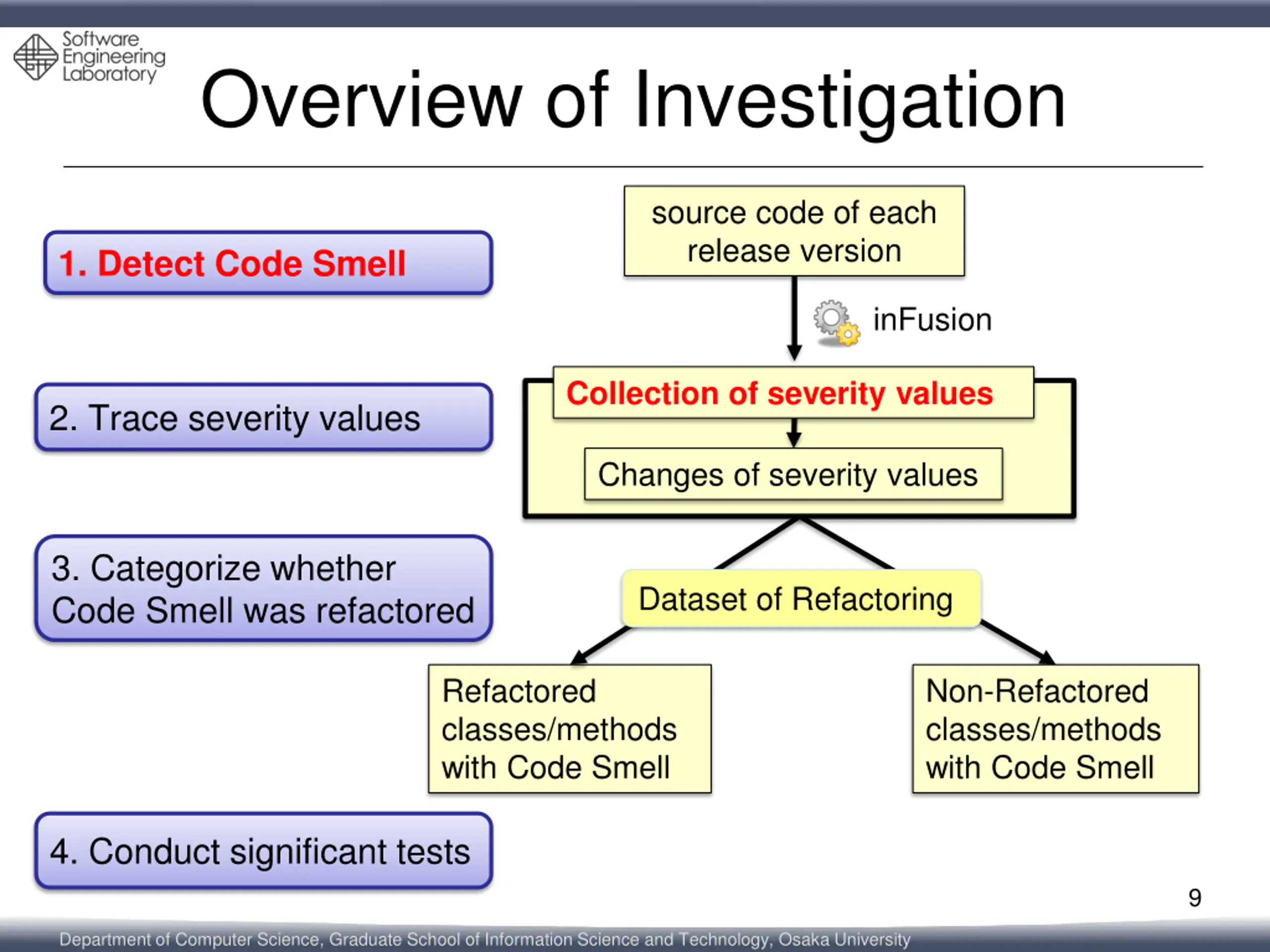 Overview of Investigation source code of each release version 1. Detect Code Smell inFusion Collection of severity values 2. Trace severity values Changes of severity values 3. Categorize whether Code Smell was refactored Dataset of Refactoring Refactored classes/methods with Code Smell Non-Refactored classes/methods with Code Smell 4. Conduct significant tests 9 Department of Computer Science, Graduate School of Information Science and Technology, Osaka University