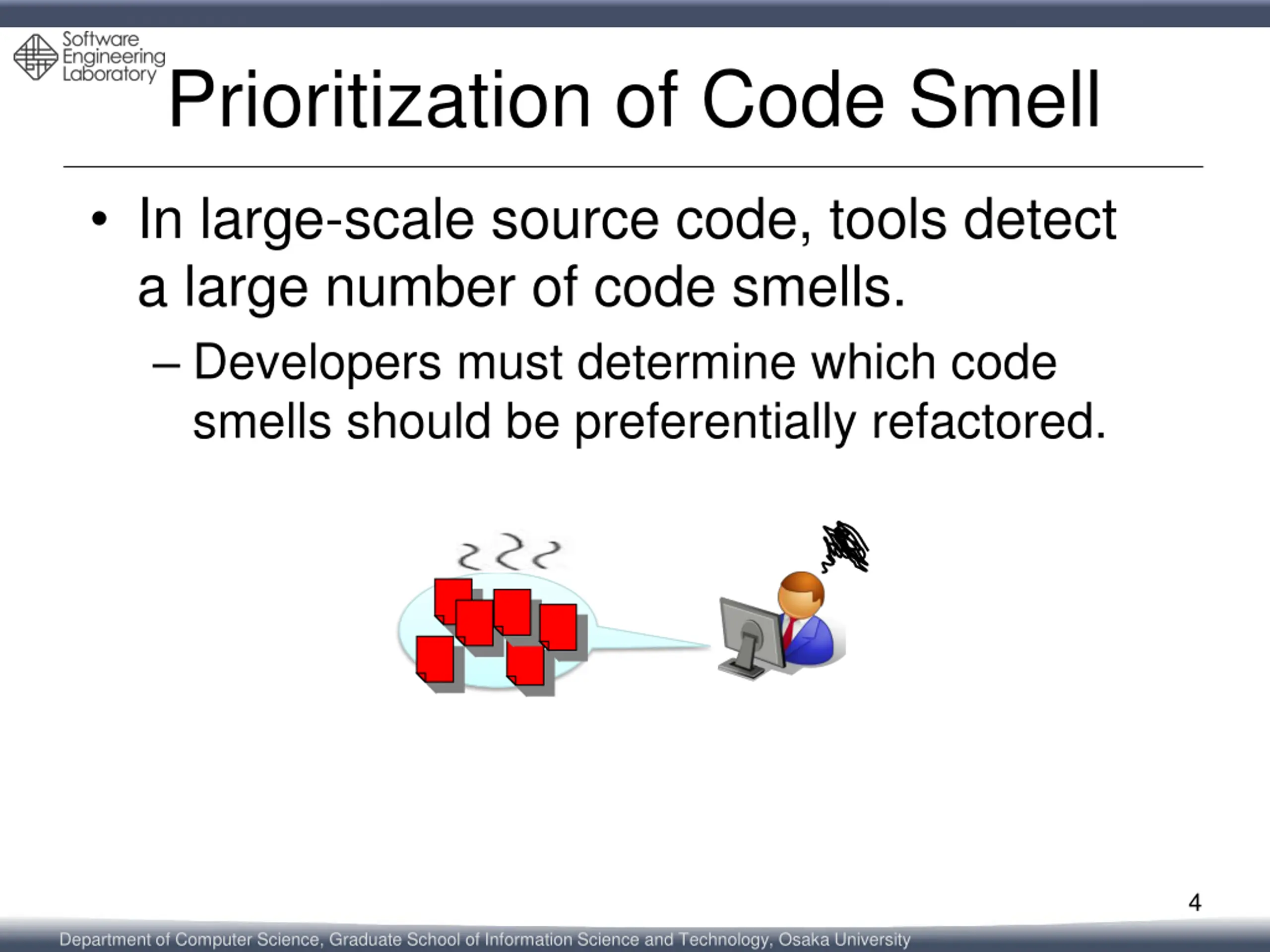 Prioritization of Code Smell In large-scale source code, tools detect a large number of code smells. Developers must determine which code smells should be preferentially refactored. 4 Department of Computer Science, Graduate School of Information Science and Technology, Osaka University