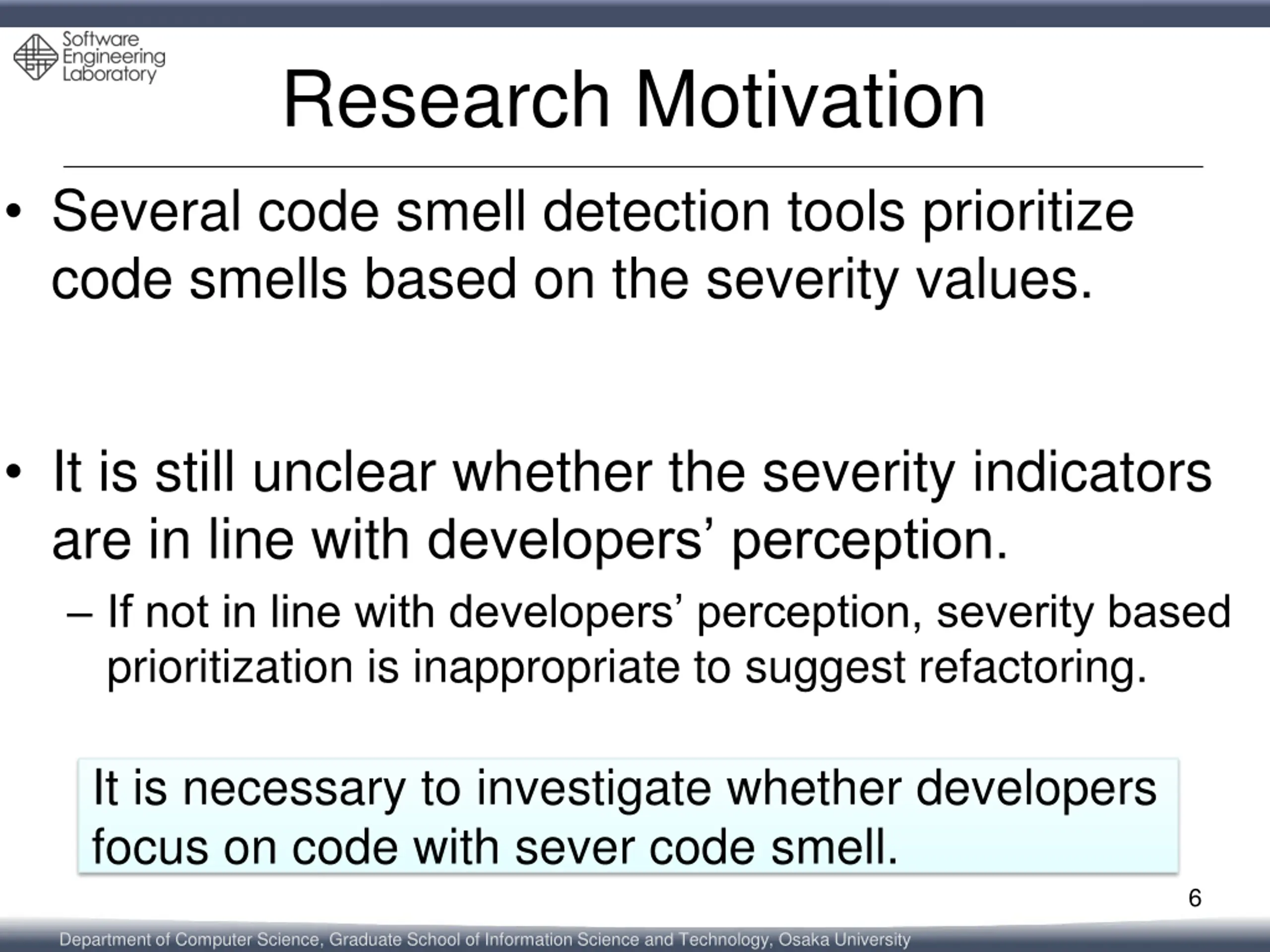 Research Motivation Several code smell detection tools prioritize code smells based on the severity values. It is still unclear whether the severity indicators are in line with developers perception. If not in line with developers perception, severity based prioritization is inappropriate to suggest refactoring. It is necessary to investigate whether developers focus on code with sever code smell. 6 Department of Computer Science, Graduate School of Information Science and Technology, Osaka University