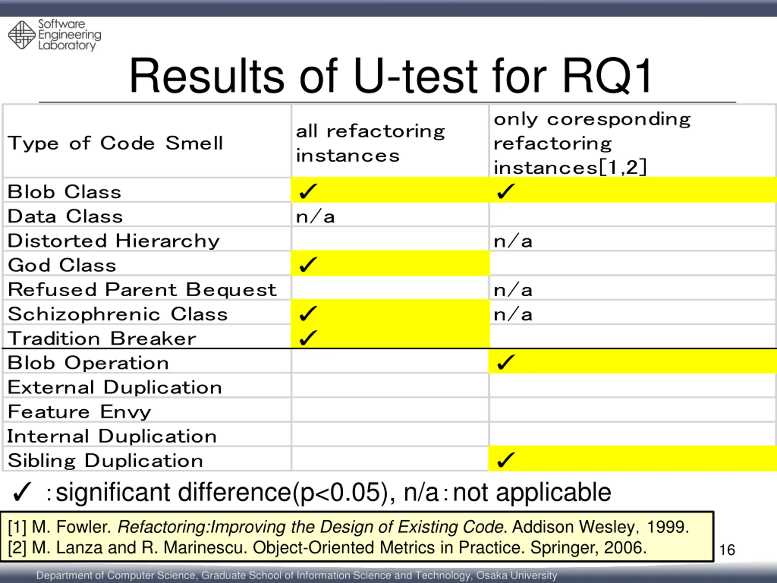 Significant Test For RQ1 RQ1 Do developers perform refactoring more frequently on code with more sever code smell? whether refactored classes/methods have more severe code smells than non-refactored classes/methods We conducted the Mann-Whitney U test, a nonparametric significance test. Group of Refactored Blob Class Group of Non-Refactored Blob Class release 1 class Class A severity 4 release 1 class Class B severity 4 Compare the severity among the same type of Code Smell 1 Class D 10 1 Class C 2 2 Class A 4 2 Class B 8 15 Department of Computer Science, Graduate School of Information Science and Technology, Osaka University