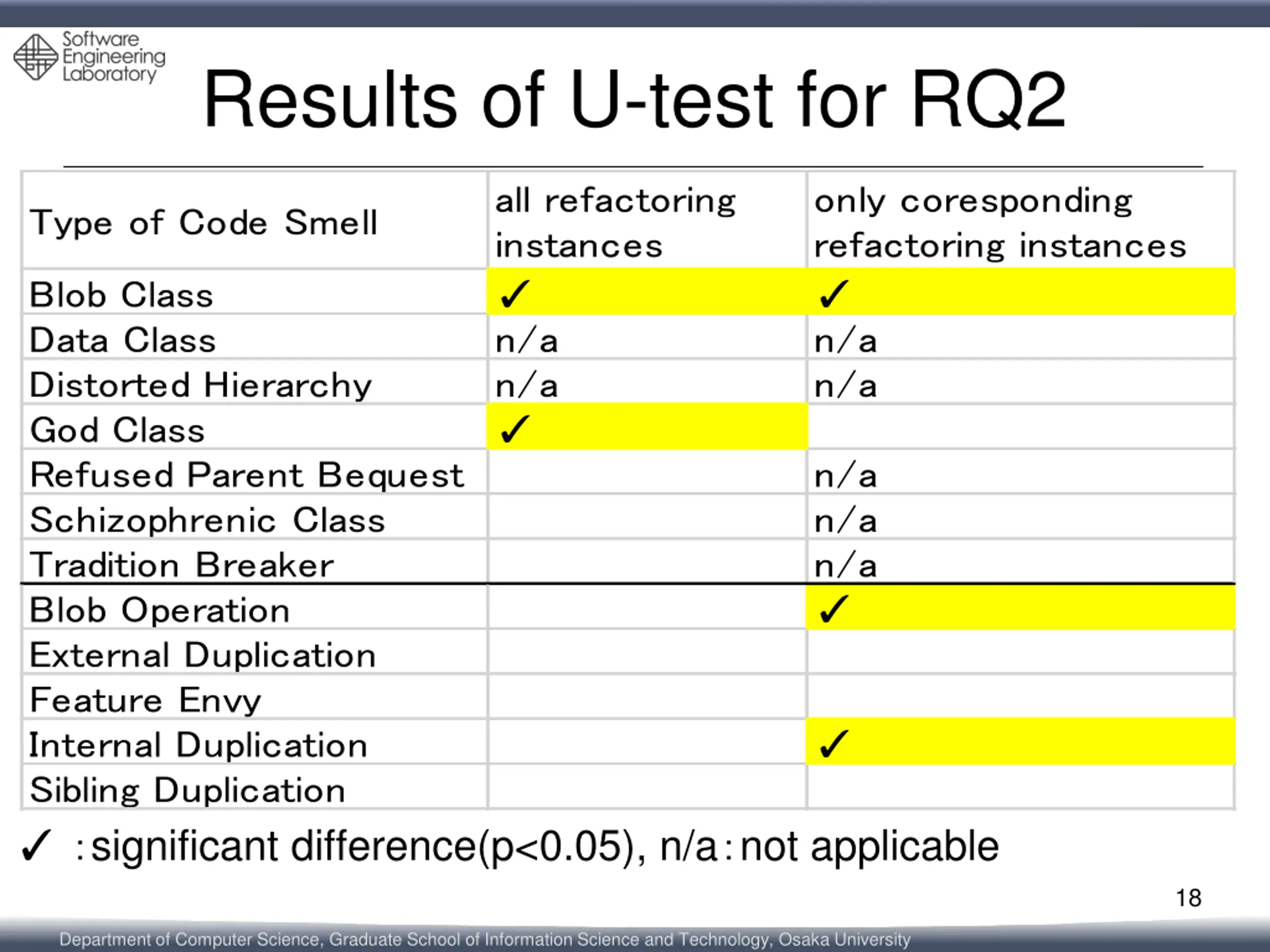 Results of U-test for RQ2 all refactoring instances n/a n/a only coresponding refactoring instances n/a n/a Type of Code Smell Blob Class Data Class Distorted Hierarchy God Class Refused Parent Bequest Schizophrenic Class Tradition Breaker Blob Operation External Duplication Feature Envy Internal Duplication Sibling Duplication n/a n/a n/a significant difference(p<0.05), n/a not applicable 18 Department of Computer Science, Graduate School of Information Science and Technology, Osaka University