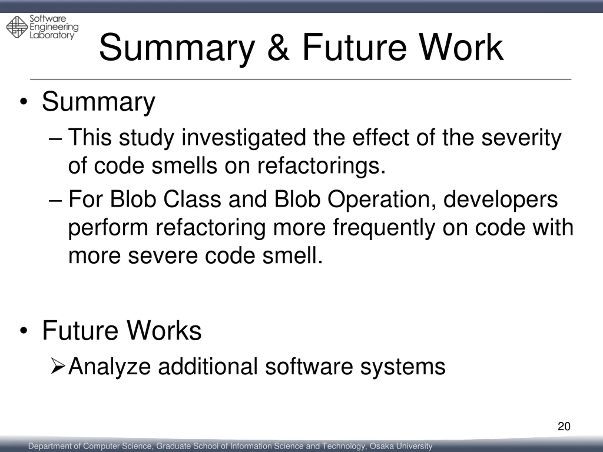 Summary of Results Only Blob Class and Blob Operation showed significant differences for both RQ1 and RQ2. Refactoring was performed more frequently on code with more severe code smell. Refactoring significantly decreased the severity. The severity was not a useful indicator for the other types of Code Smell. For Blob Class and Blob Operation, it is useful to preferentially show more severe Code Smell to developers. 19 Department of Computer Science, Graduate School of Information Science and Technology, Osaka University