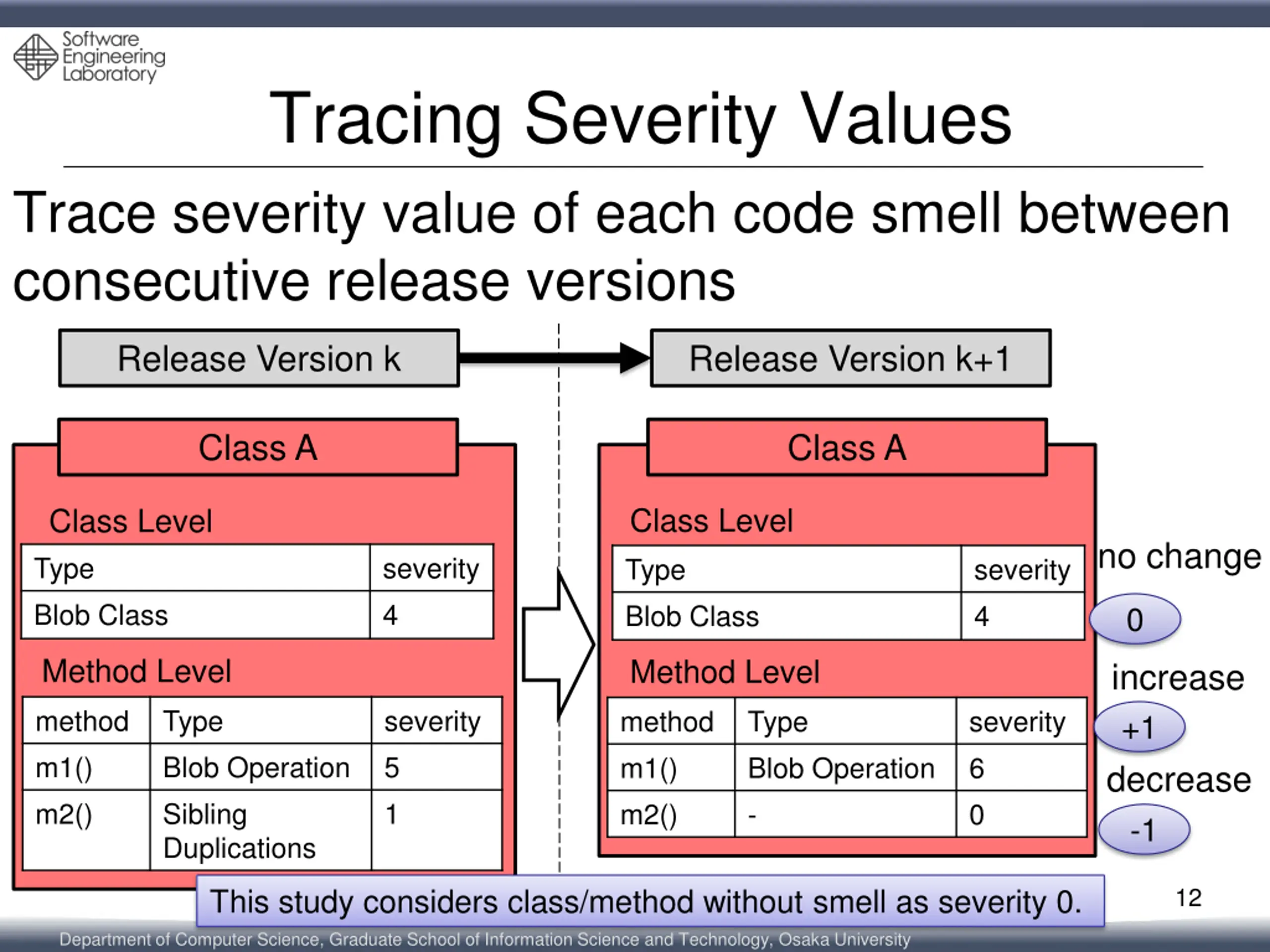 Tracing Severity Values Trace severity value of each code smell between consecutive release versions Release Version k Release Version k+1 Class A Class A Class Level Class Level no change Type Blob Class severity 4 Type Blob Class severity 4 0 Method Level Method Level increase +1 method m1() m2() Type Blob Operation Sibling Duplications severity 5 1 method m1() m2() Type Blob Operation - severity 6 0 decrease -1 This study considers class/method without smell as severity 0. 12 Department of Computer Science, Graduate School of Information Science and Technology, Osaka University