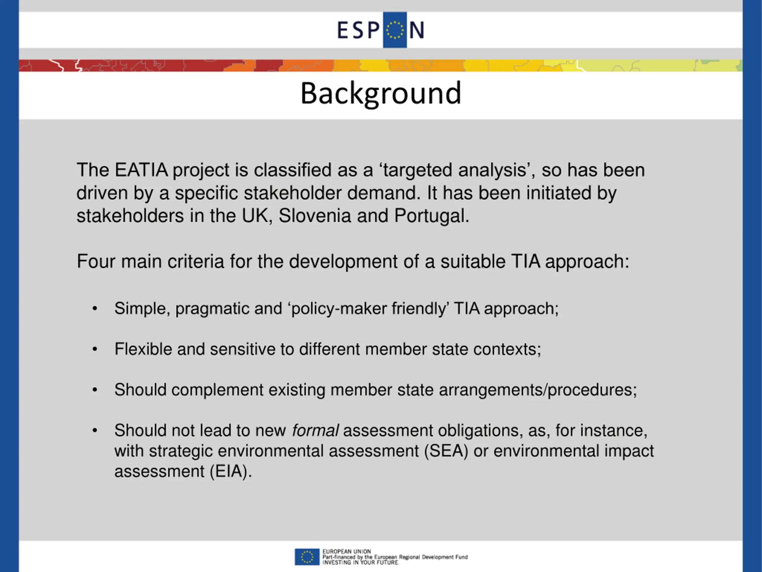 Background The EATIA project is classified as a targeted analysis , so has been driven by a specific stakeholder demand. It has been initiated by stakeholders in the UK, Slovenia and Portugal. Four main criteria for the development of a suitable TIA approach: Simple, pragmatic and policy-maker friendly TIA approach; Flexible and sensitive to different member state contexts; Should complement existing member state arrangements/procedures; Should not lead to new formal assessment obligations, as, for instance, with strategic environmental assessment (SEA) or environmental impact assessment (EIA).