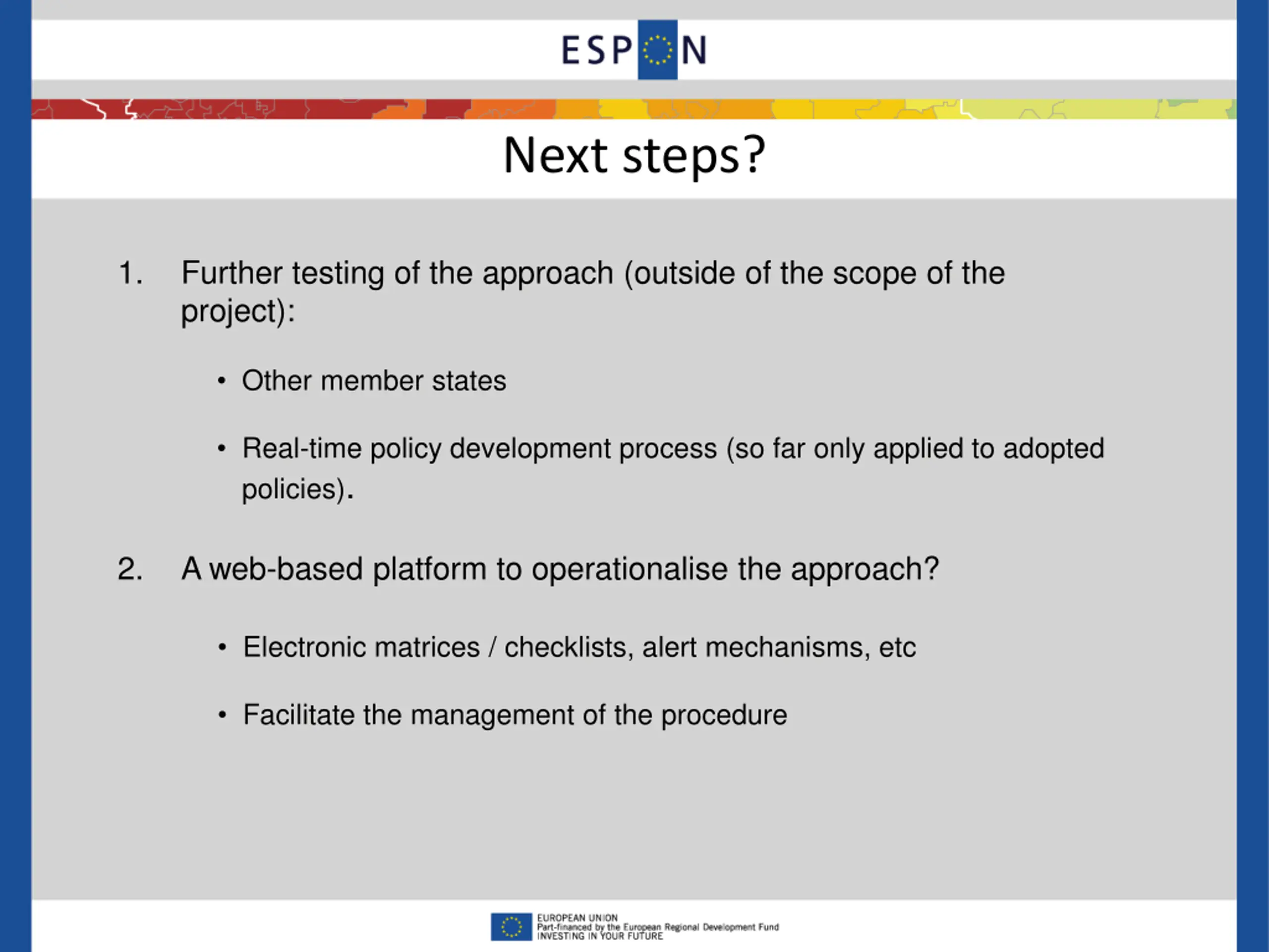 Next steps? 1. Further testing of the approach (outside of the scope of the project): Other member states Real-time policy development process (so far only applied to adopted policies). 2. A web-based platform to operationalise the approach? Electronic matrices / checklists, alert mechanisms, etc Facilitate the management of the procedure