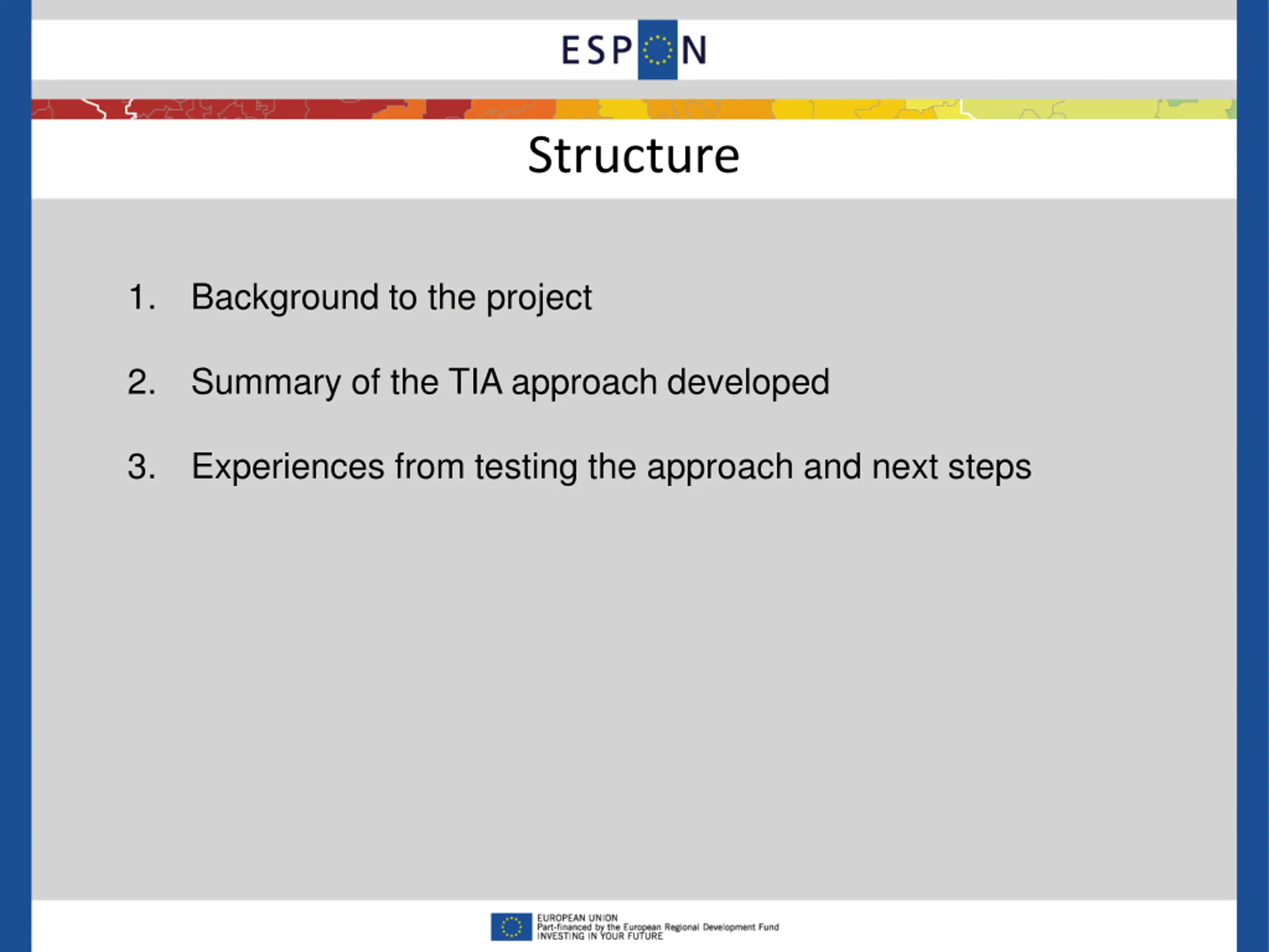 Structure 1. Background to the project 2. Summary of the TIA approach developed 3. Experiences from testing the approach and next steps