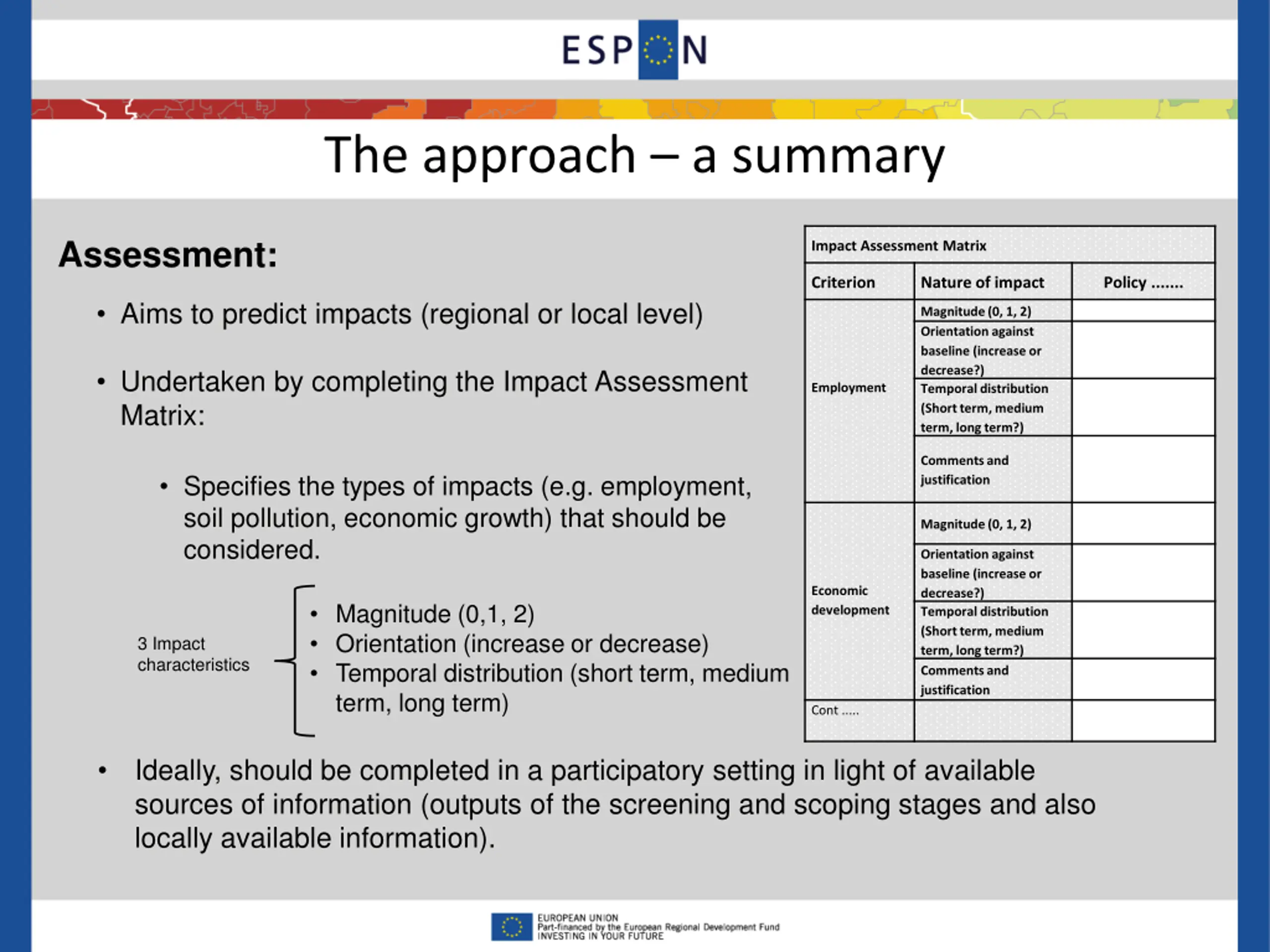 The approach a summary Assessment: Impact Assessment Matrix Criterion Nature of impact Policy ....... Aims to predict impacts (regional or local level) Magnitude (0, 1, 2) Orientation against baseline (increase or decrease?) Temporal distribution (Short term, medium term, long term?) Undertaken by completing the Impact Assessment Matrix: Employment Comments and justification Specifies the types of impacts (e.g. employment, soil pollution, economic growth) that should be considered. Magnitude (0, 1, 2) Orientation against baseline (increase or decrease?) Temporal distribution (Short term, medium term, long term?) Comments and justification Economic development Magnitude (0,1, 2) Orientation (increase or decrease) Temporal distribution (short term, medium term, long term) 3 Impact characteristics Cont ..... Ideally, should be completed in a participatory setting in light of available sources of information (outputs of the screening and scoping stages and also locally available information).