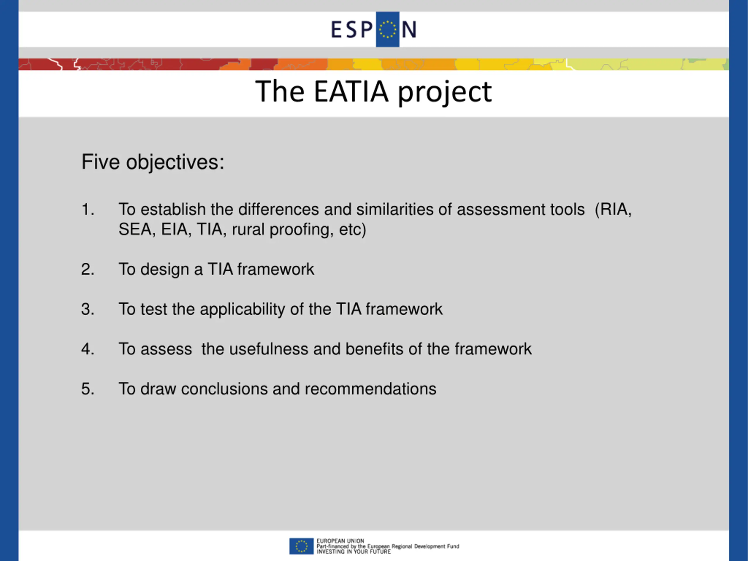 The EATIA project Five objectives: 1. To establish the differences and similarities of assessment tools (RIA, SEA, EIA, TIA, rural proofing, etc) 2. To design a TIA framework 3. To test the applicability of the TIA framework 4. To assess the usefulness and benefits of the framework 5. To draw conclusions and recommendations