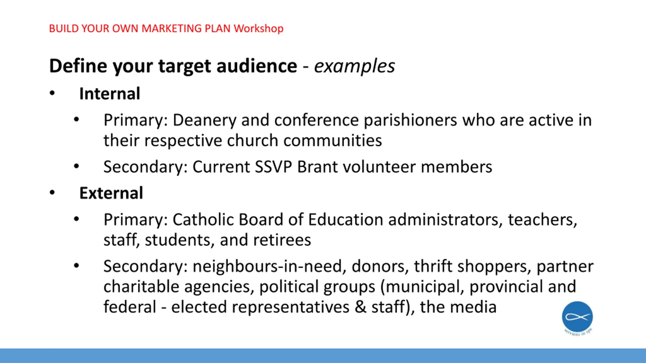 BUILD YOUR OWN MARKETING PLAN Workshop Define your target audience - examples Internal Primary: Deanery and conference parishioners who are active in their respective church communities Secondary: Current SSVP Brant volunteer members External Primary: Catholic Board of Education administrators, teachers, staff, students, and retirees Secondary: neighbours-in-need, donors, thrift shoppers, partner charitable agencies, political groups (municipal, provincial and federal - elected representatives & staff), the media
