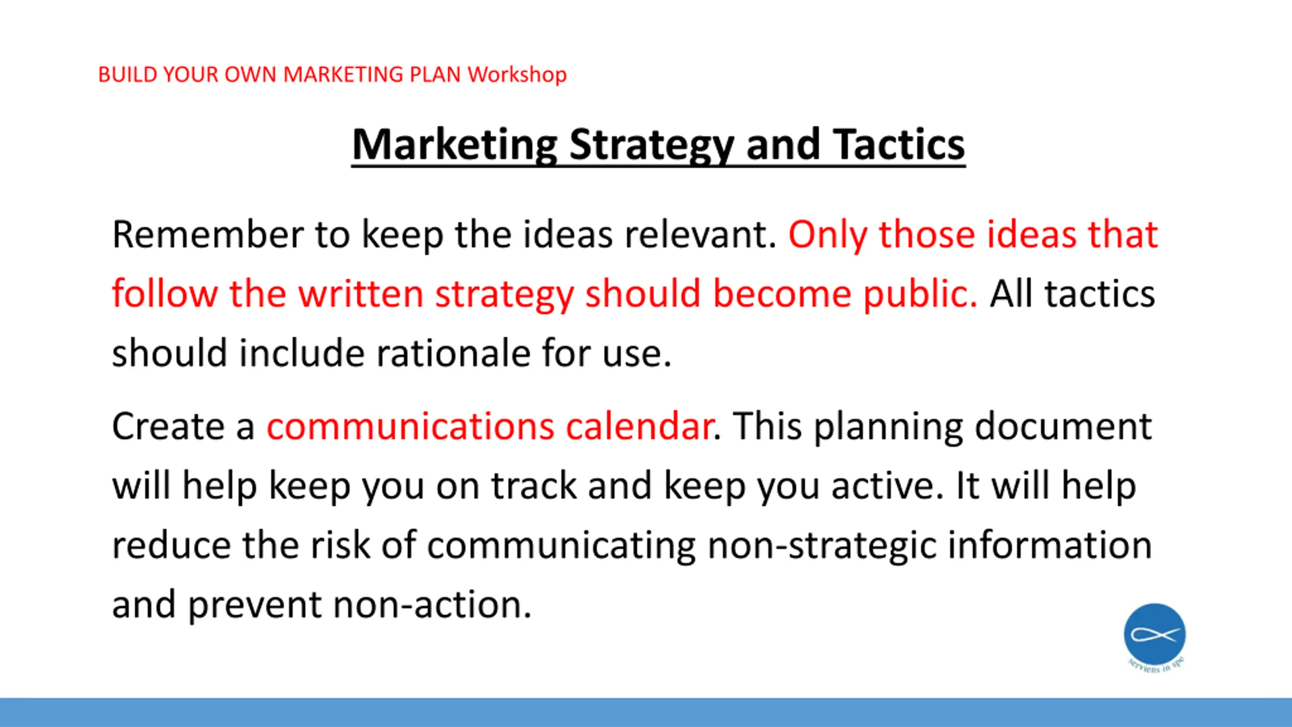 BUILD YOUR OWN MARKETING PLAN Workshop Marketing Strategy and Tactics Remember to keep the ideas relevant. Only those ideas that follow the written strategy should become public. All tactics should include rationale for use. Create a communications calendar. This planning document will help keep you on track and keep you active. It will help reduce the risk of communicating non-strategic information and prevent non-action.