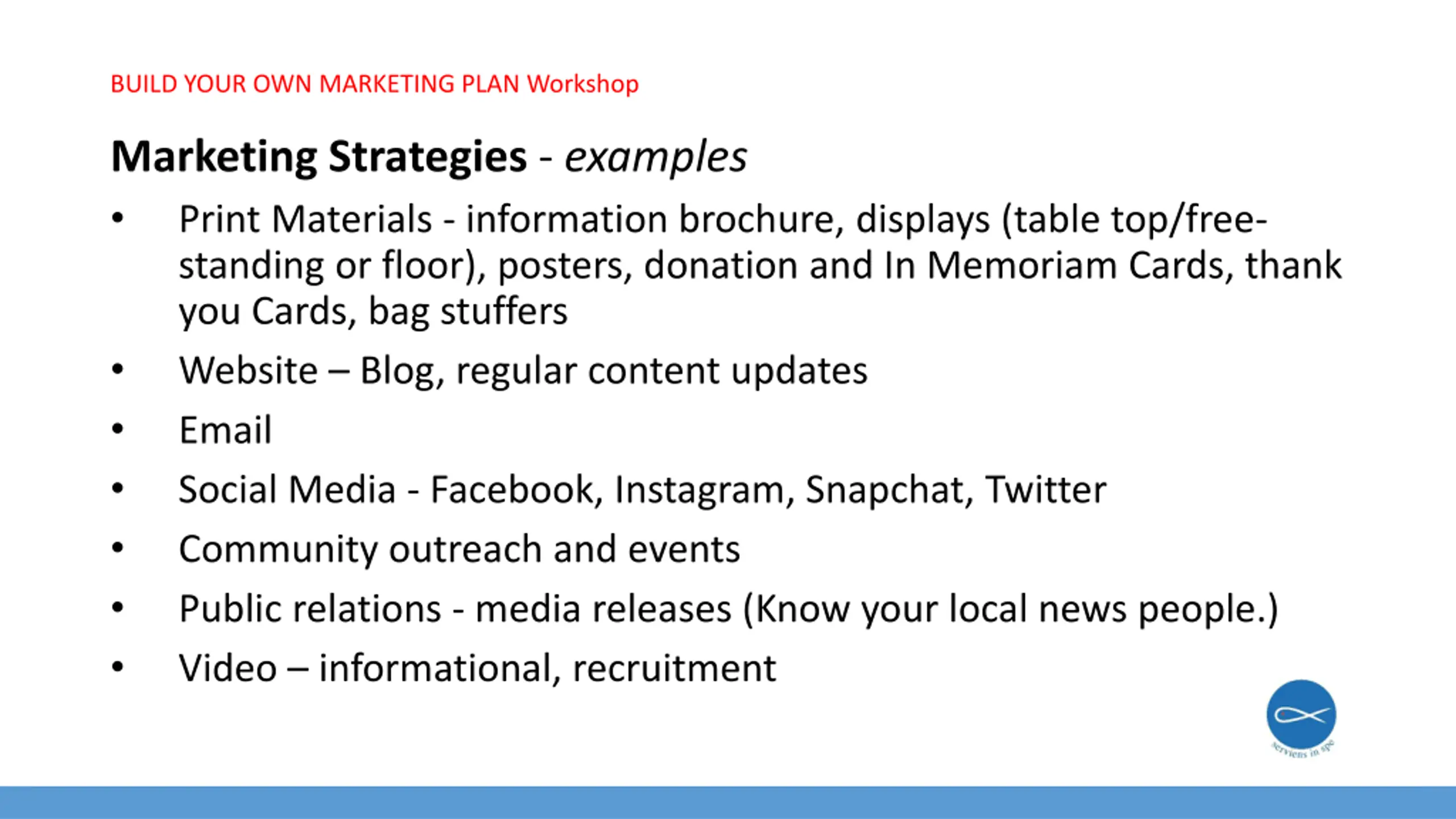 BUILD YOUR OWN MARKETING PLAN Workshop Marketing Strategies - examples Print Materials - information brochure, displays (table top/free- standing or floor), posters, donation and In Memoriam Cards, thank you Cards, bag stuffers Website Blog, regular content updates Email Social Media - Facebook, Instagram, Snapchat, Twitter Community outreach and events Public relations - media releases (Know your local news people.) Video informational, recruitment