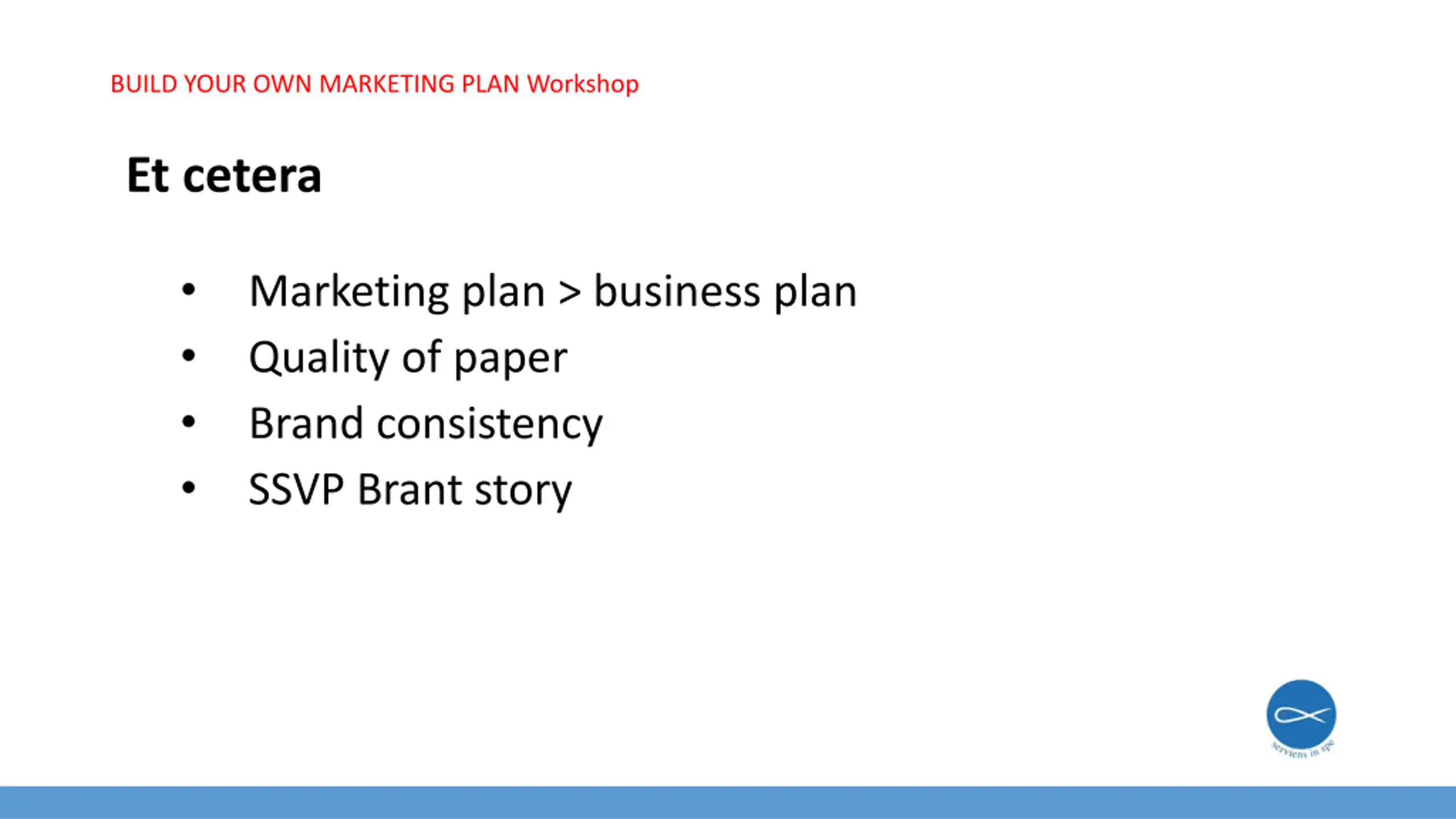 BUILD YOUR OWN MARKETING PLAN Workshop Et cetera Marketing plan > business plan Quality of paper Brand consistency SSVP Brant story