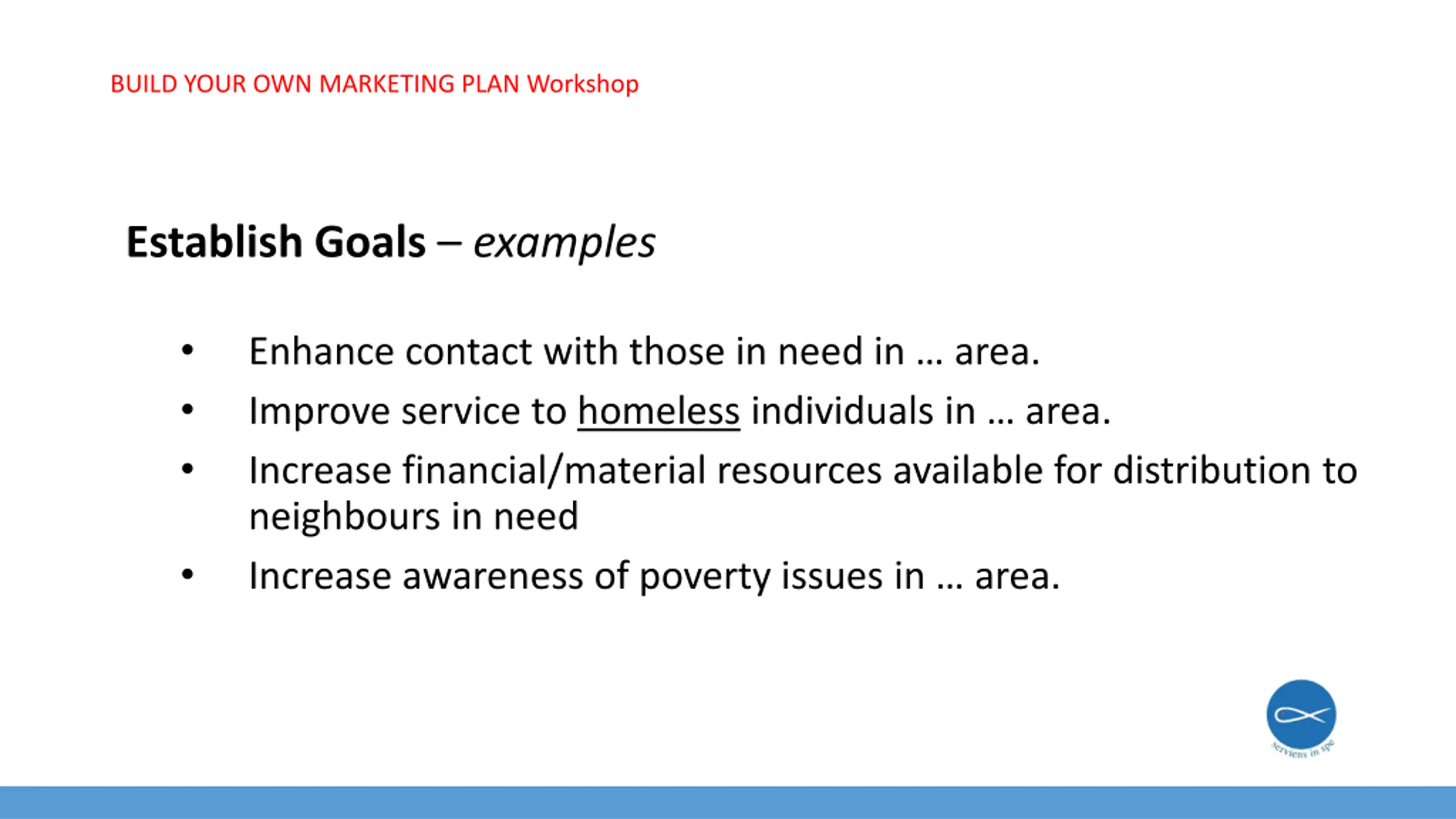 BUILD YOUR OWN MARKETING PLAN Workshop Establish Goals examples Enhance contact with those in need in area. Improve service to homeless individuals in area. Increase financial/material resources available for distribution to neighbours in need Increase awareness of poverty issues in area.