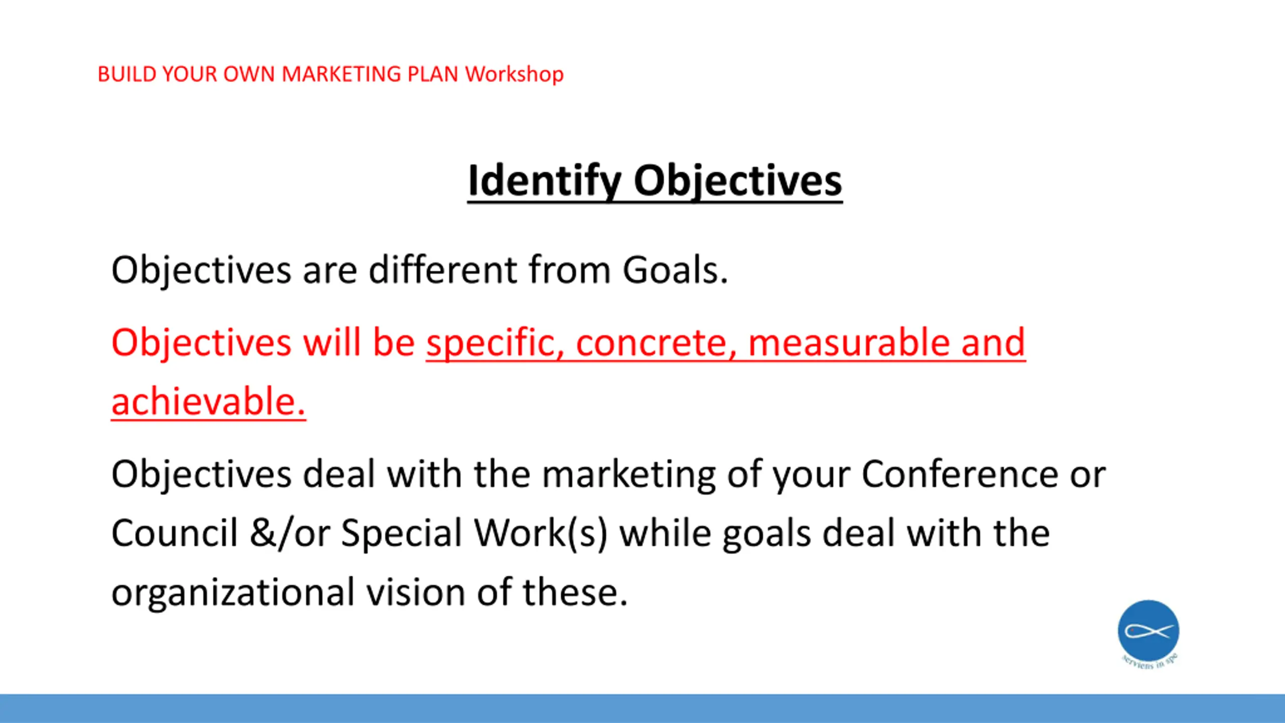BUILD YOUR OWN MARKETING PLAN Workshop Identify Objectives Objectives are different from Goals. Objectives will be specific, concrete, measurable and achievable. Objectives deal with the marketing of your Conference or Council &/or Special Work(s) while goals deal with the organizational vision of these.