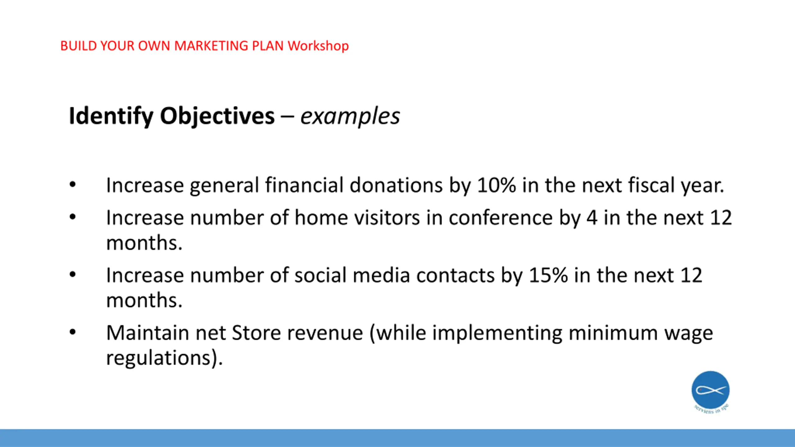 BUILD YOUR OWN MARKETING PLAN Workshop Identify Objectives examples Increase general financial donations by 10% in the next fiscal year. Increase number of home visitors in conference by 4 in the next 12 months. Increase number of social media contacts by 15% in the next 12 months. Maintain net Store revenue (while implementing minimum wage regulations).