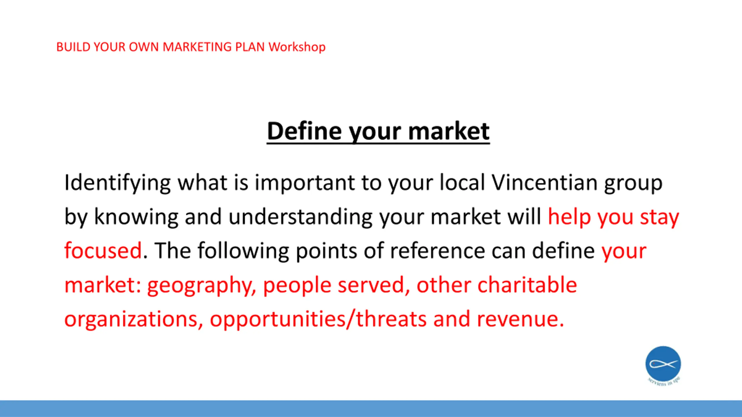 BUILD YOUR OWN MARKETING PLAN Workshop Define your market Identifying what is important to your local Vincentian group by knowing and understanding your market will help you stay focused. The following points of reference can define your market: geography, people served, other charitable organizations, opportunities/threats and revenue.