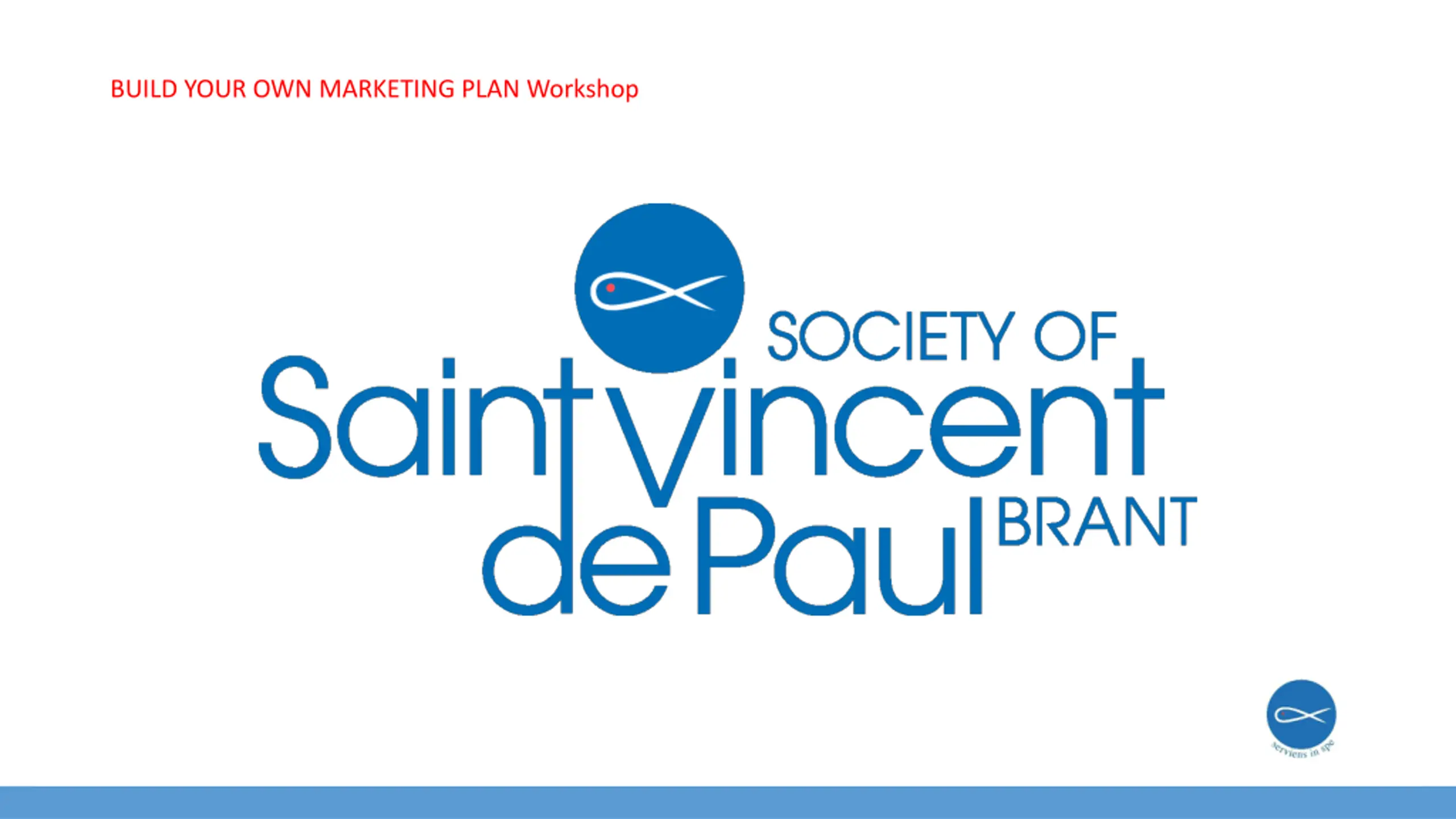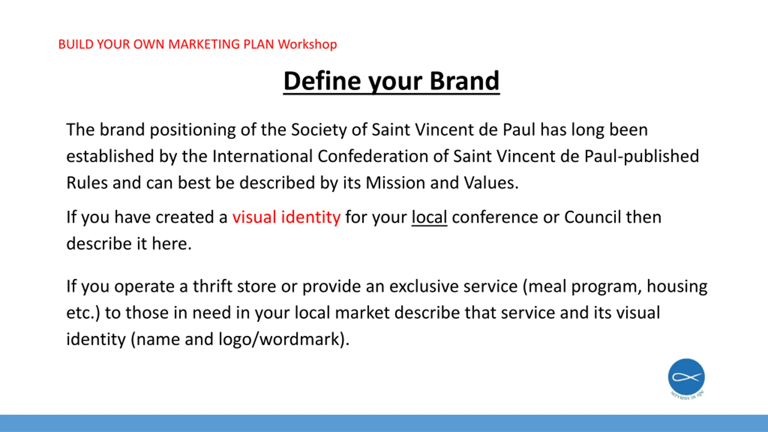 BUILD YOUR OWN MARKETING PLAN Workshop Define your Brand The brand positioning of the Society of Saint Vincent de Paul has long been established by the International Confederation of Saint Vincent de Paul-published Rules and can best be described by its Mission and Values. If you have created a visual identity for your local conference or Council then describe it here. If you operate a thrift store or provide an exclusive service (meal program, housing etc.) to those in need in your local market describe that service and its visual identity (name and logo/wordmark).