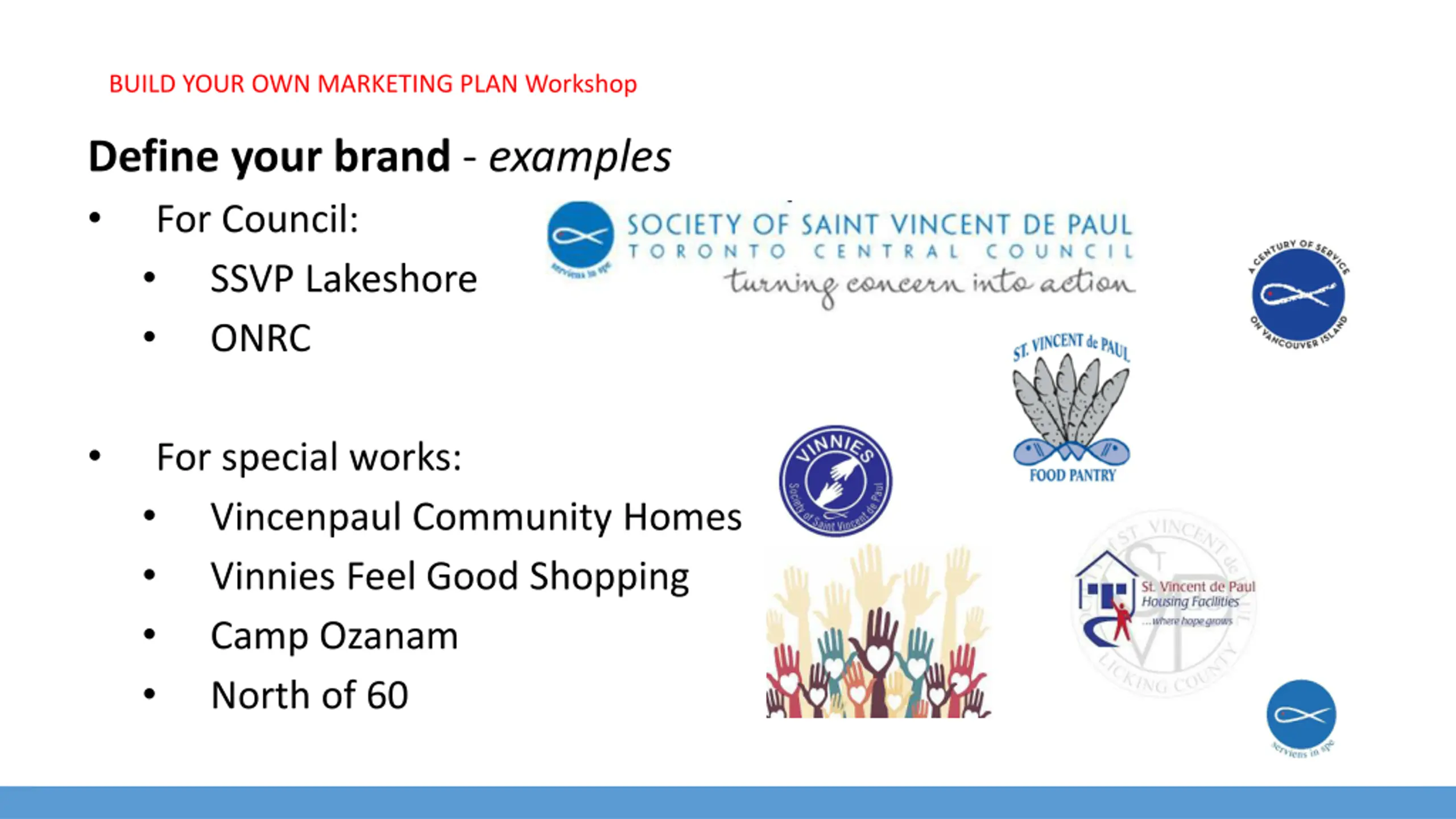 BUILD YOUR OWN MARKETING PLAN Workshop Define your brand - examples For Council: SSVP Lakeshore ONRC For special works: Vincenpaul Community Homes Vinnies Feel Good Shopping Camp Ozanam North of 60