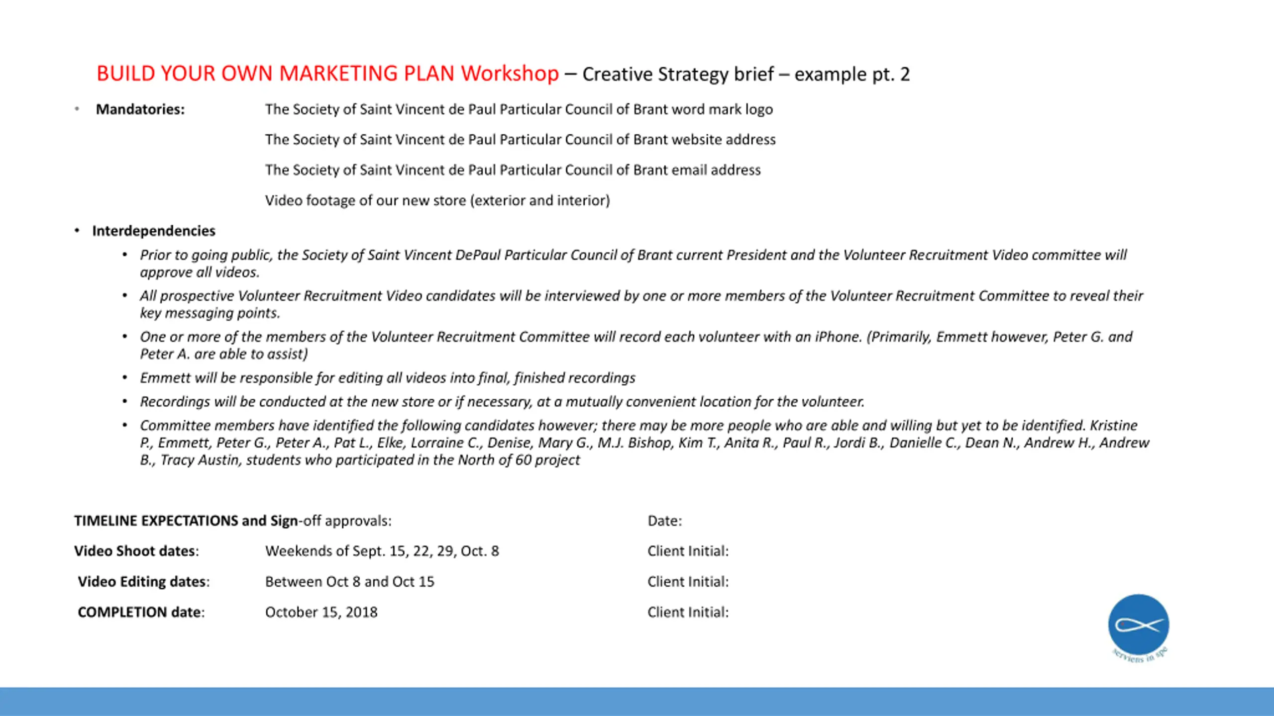 BUILD YOUR OWN MARKETING PLAN Workshop Creative Strategy brief example pt. 2 Mandatories: The Society of Saint Vincent de Paul Particular Council of Brant word mark logo The Society of Saint Vincent de Paul Particular Council of Brant website address The Society of Saint Vincent de Paul Particular Council of Brant email address Video footage of our new store (exterior and interior) Interdependencies Prior to going public, the Society of Saint Vincent DePaul Particular Council of Brant current President and the Volunteer Recruitment Video committee will approve all videos. All prospective Volunteer Recruitment Video candidates will be interviewed by one or more members of the Volunteer Recruitment Committee to reveal their key messaging points. One or more of the members of the Volunteer Recruitment Committee will record each volunteer with an iPhone. (Primarily, Emmett however, Peter G. and Peter A. are able to assist) Emmett will be responsible for editing all videos into final, finished recordings Recordings will be conducted at the new store or if necessary, at a mutually convenient location for the volunteer. Committee members have identified the following candidates however; there may be more people who are able and willing but yet to be identified. Kristine P., Emmett, Peter G., Peter A., Pat L., Elke, Lorraine C., Denise, Mary G., M.J. Bishop, Kim T., Anita R., Paul R., Jordi B., Danielle C., Dean N., Andrew H., Andrew B., Tracy Austin, students who participated in the North of 60 project TIMELINE EXPECTATIONS and Sign-off approvals: Date: Video Shoot dates: Weekends of Sept. 15, 22, 29, Oct. 8 Client Initial: Video Editing dates: Between Oct 8 and Oct 15 Client Initial: COMPLETION date: October 15, 2018 Client Initial: