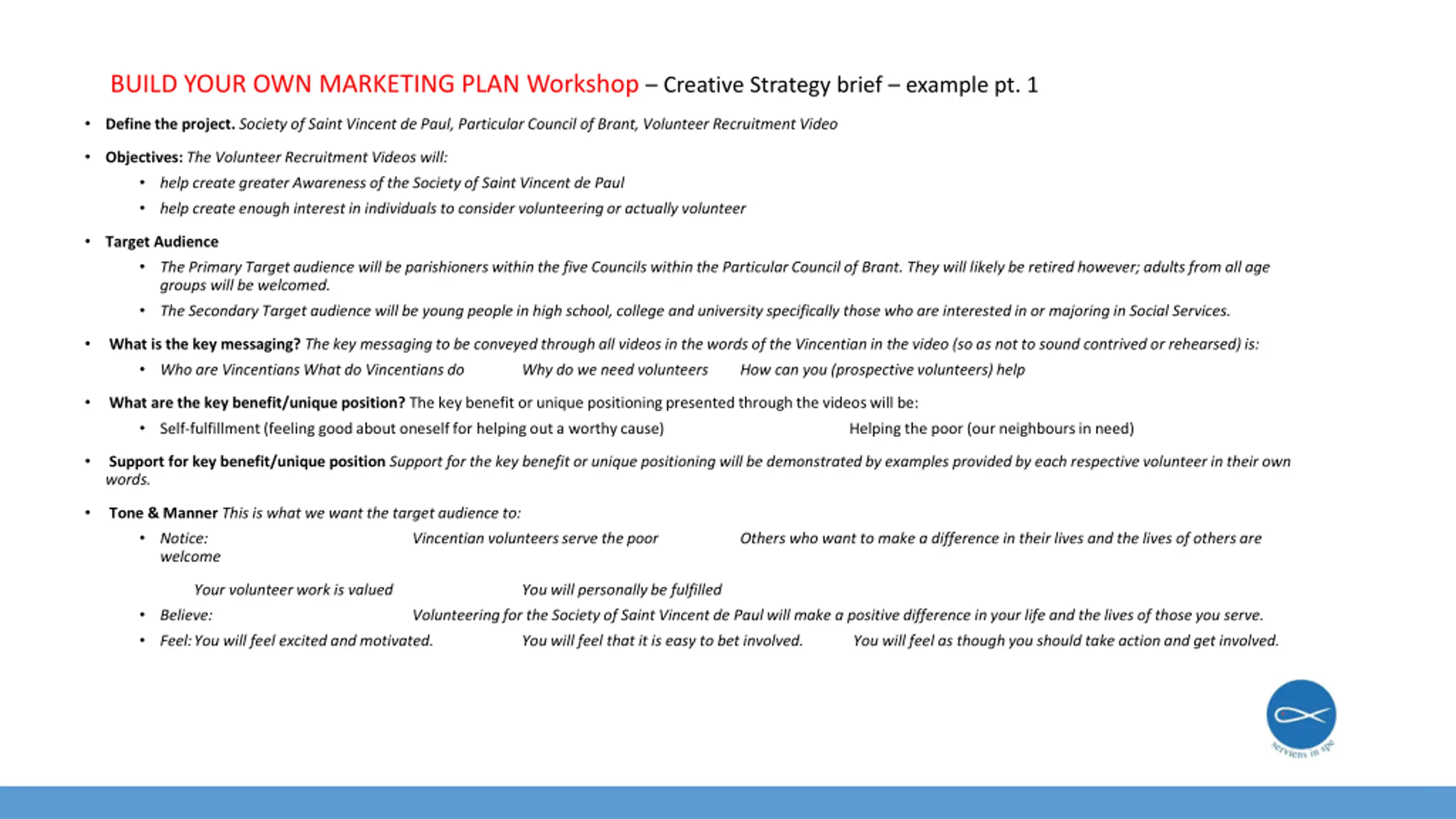 BUILD YOUR OWN MARKETING PLAN Workshop Creative Strategy brief example pt. 1 Define the project. Society of Saint Vincent de Paul, Particular Council of Brant, Volunteer Recruitment Video Objectives: The Volunteer Recruitment Videos will: help create greater Awareness of the Society of Saint Vincent de Paul help create enough interest in individuals to consider volunteering or actually volunteer Target Audience The Primary Target audience will be parishioners within the five Councils within the Particular Council of Brant. They will likely be retired however; adults from all age groups will be welcomed. The Secondary Target audience will be young people in high school, college and university specifically those who are interested in or majoring in Social Services. What is the key messaging? The key messaging to be conveyed through all videos in the words of the Vincentian in the video (so as not to sound contrived or rehearsed) is: Who are VincentiansWhat do Vincentians do Why do we need volunteers How can you (prospective volunteers) help What are the key benefit/unique position? The key benefit or unique positioning presented through the videos will be: Self-fulfillment (feeling good about oneself for helping out a worthy cause) Helping the poor (our neighbours in need) Support for key benefit/unique position Support for the key benefit or unique positioning will be demonstrated by examples provided by each respective volunteer in their own words. Tone & Manner This is what we want the target audience to: Notice: welcome Vincentian volunteers serve the poor Others who want to make a difference in their lives and the lives of others are Your volunteer work is valued Believe: Feel:You will feel excited and motivated. You will personally be fulfilled Volunteering for the Society of Saint Vincent de Paul will make a positive difference in your life and the lives of those you serve. You will feel that it is easy to bet involved. You will feel as though you should take action and get involved.