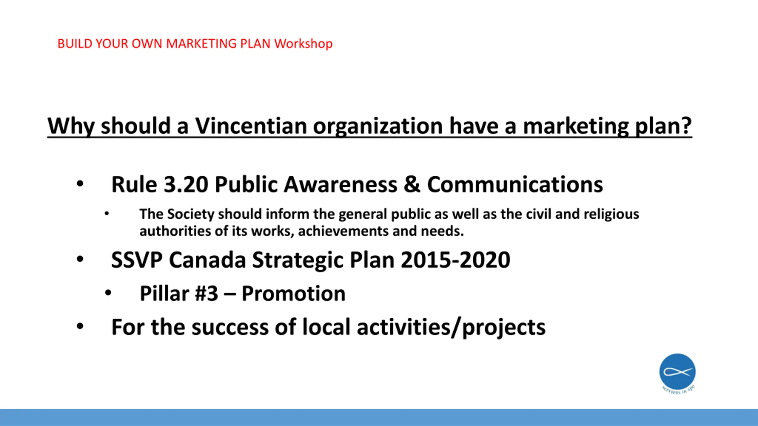 BUILD YOUR OWN MARKETING PLAN Workshop Why should a Vincentian organization have a marketing plan? Rule 3.20 Public Awareness & Communications The Society should inform the general public as well as the civil and religious authorities of its works, achievements and needs. SSVP Canada Strategic Plan 2015-2020 Pillar #3 Promotion For the success of local activities/projects